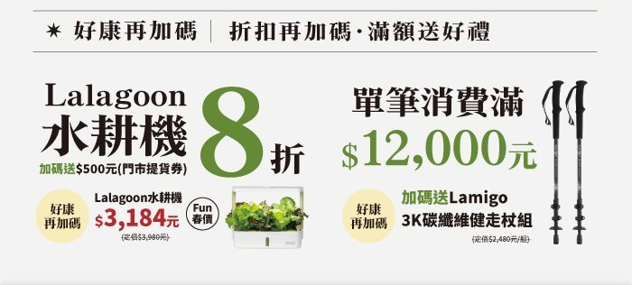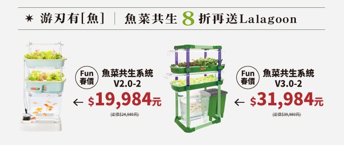 活動期間,水耕機享有8折優惠,魚菜共生系統享8折再加碼贈禮,還有滿額好禮與加碼優惠,讓你用更輕鬆的價格,打造專屬的綠意生活。