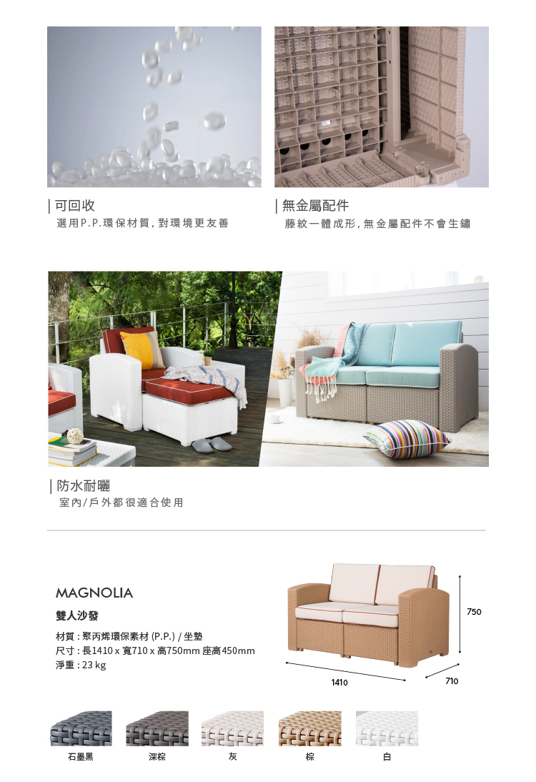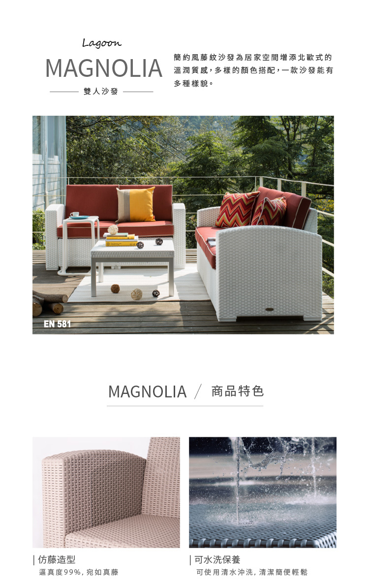 木蘭花的花語為對大自然的愛,高尚、文學氣質、花香如蘭、花形如蓮,所以又名木蓮,每當花朵含苞齊放時,宛似巨筆林立,尖直挺秀,指向藍天白雲。又稱木筆花,喜好陽光,為世界有名的庭院花木,木蓮花花朵艷而不妖,素雅而清香,具有獨特的丰姿。Magnolia就如木蓮花的精神,高尚清雅,具文學氣息,室內室外空間皆宜,可休閒可正式,典雅大器亦展現品味,堪稱最具文人氣質的產品。組合與搭配具多樣性,立體藤紋的美感展現,是傳統美學的創新與改變,能充份融入自然與家居環境之中。採用環保塑料材質加上抗UV強化,搭配戶外款坐墊便可以在室外空間使用,經得起日曬雨淋的休閒風沙發!