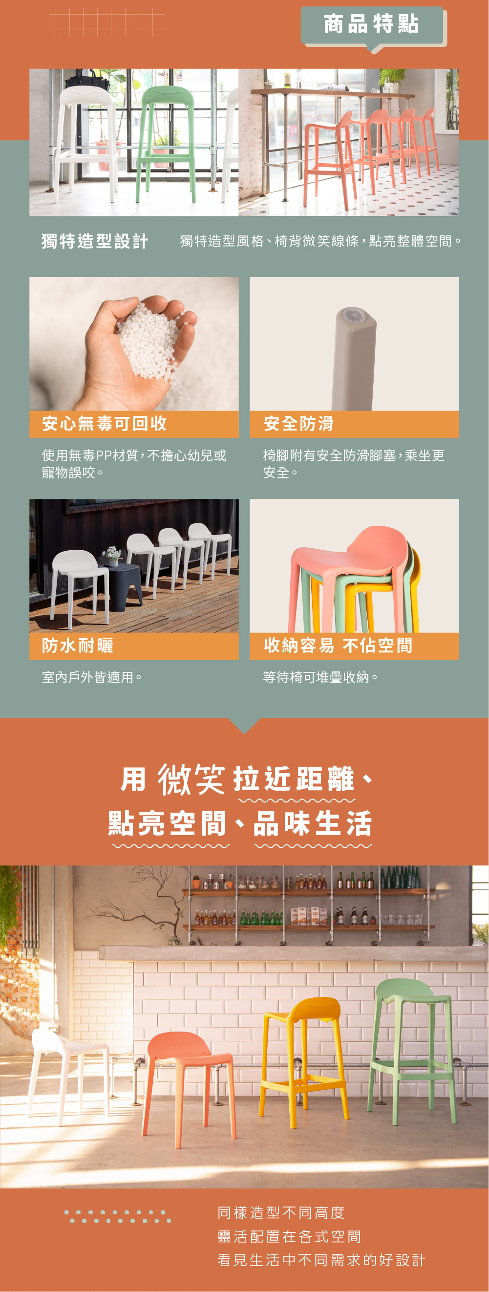 採用PP高品質塑料並有抗UV強化,戶外空間也可以使用的小椅子。5種顏色選擇多樣,可依照空間需求及室內裝修風格做搭配。可以疊放收納的設計,居家坪效大提升!
