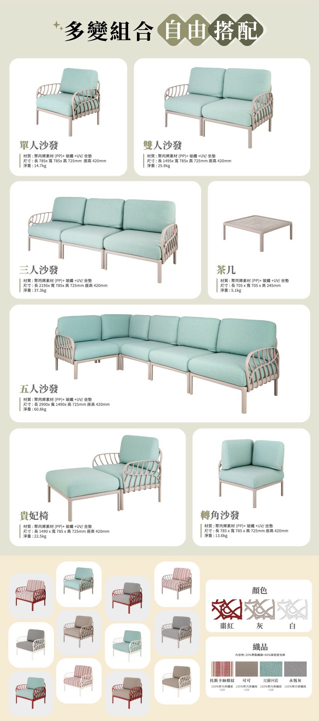 Laurel 沙發造型擷取月桂樹的枝葉,為生活空間增添自然詩意。簡潔淡雅的設計、合宜的坐椅高度、寬大舒適的墊子…置於室內高雅、戶外大方。主結構及坐墊各有3種顏色供選擇,可依照不同環境及空間氛圍自由選配。