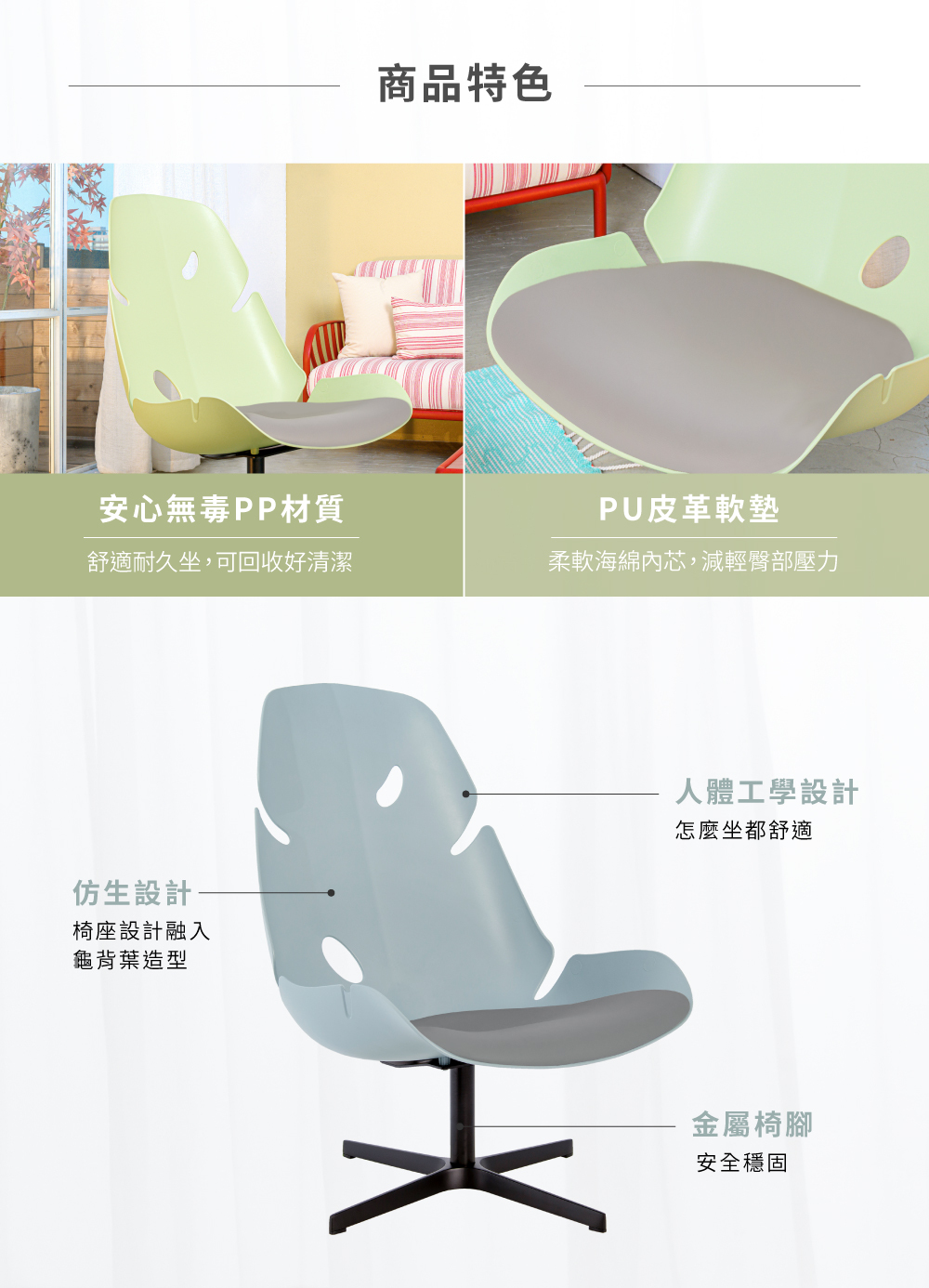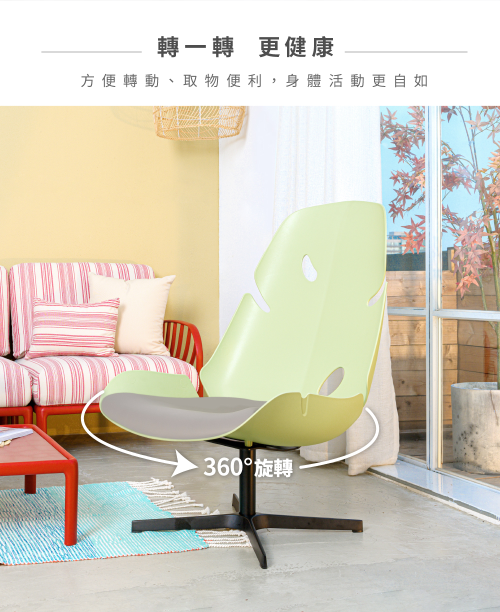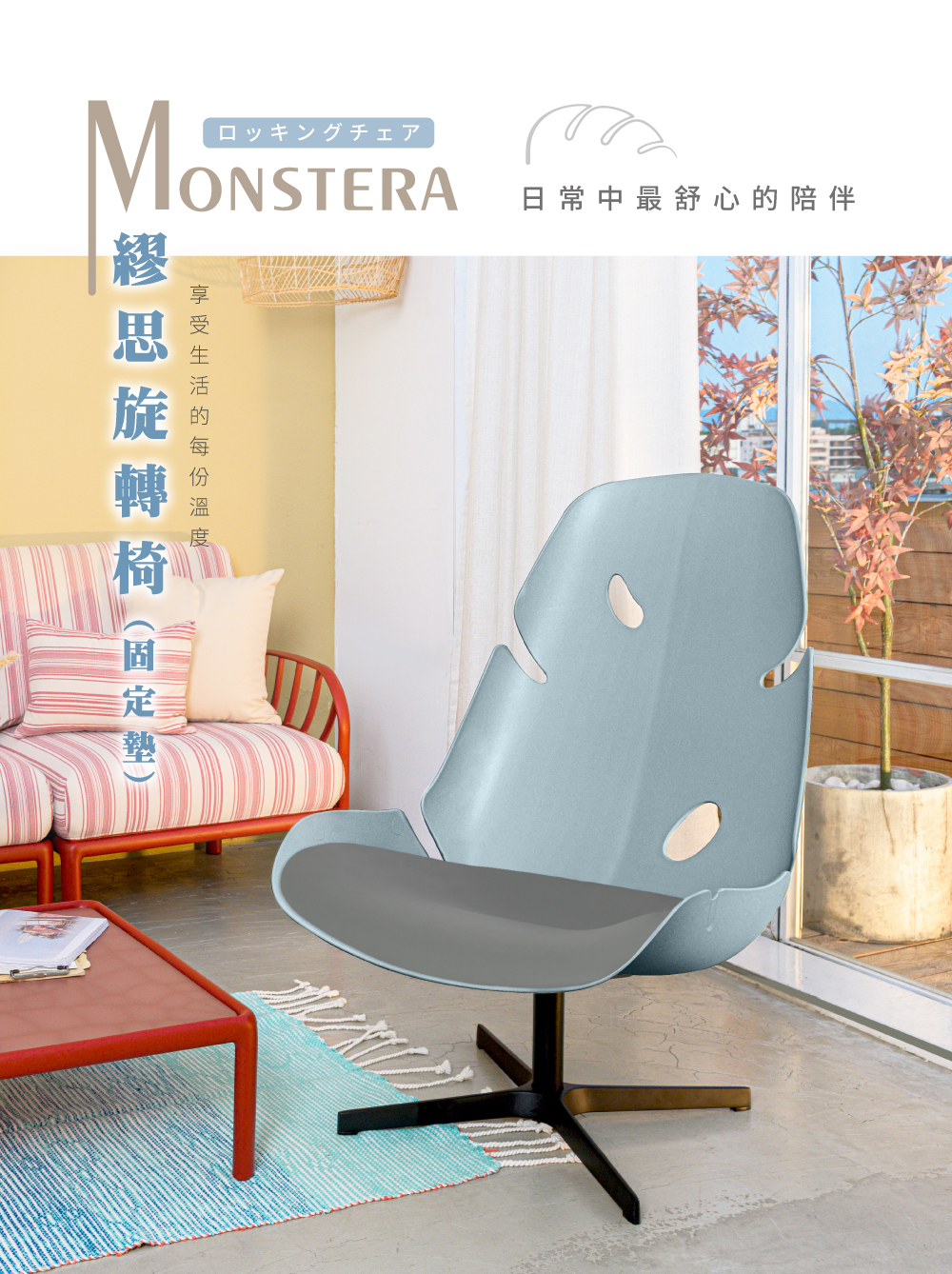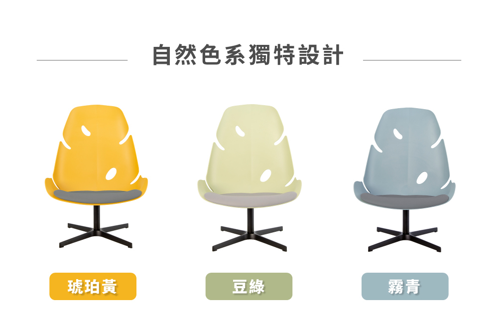 繆思椅造型元素取自Monstera;葉片形態豐富,從葉緣不規則的羽裂到狹橢圓穿孔特點為設計重點。搭配大面積底座空間如置身大自然般舒適自在。旋轉時自由靈動的優雅,為休閒空間創造出不一樣的清新氣象。