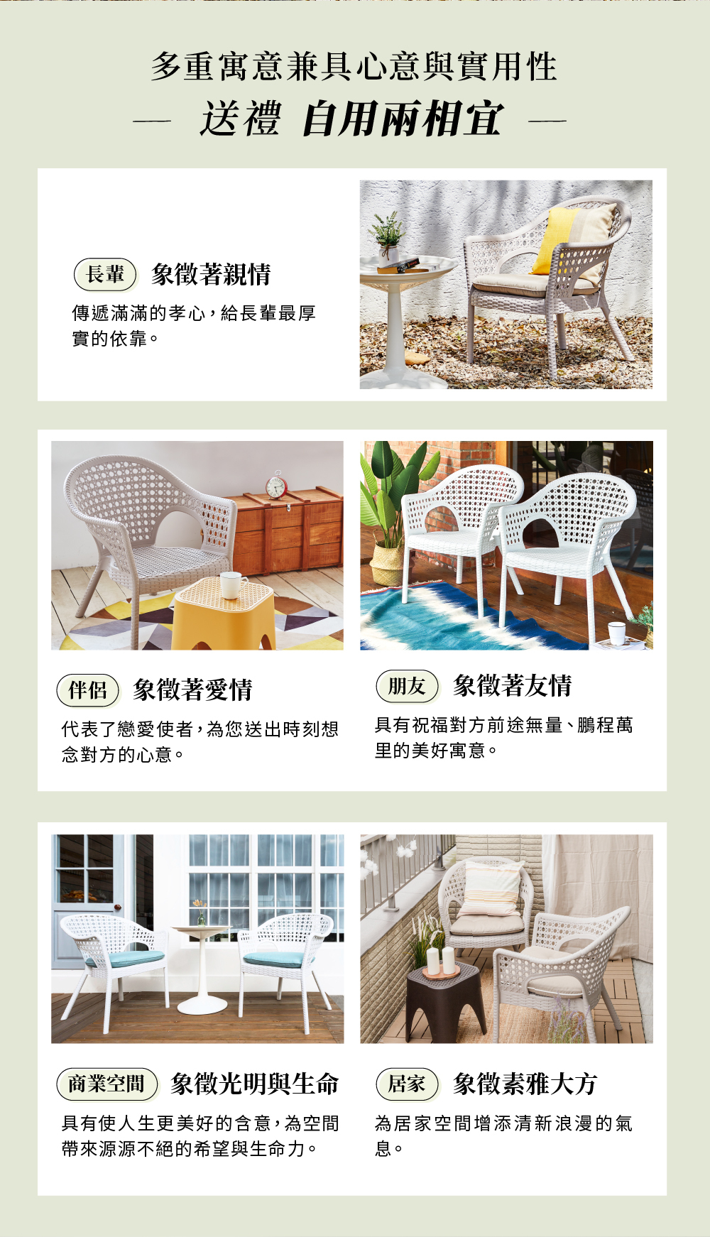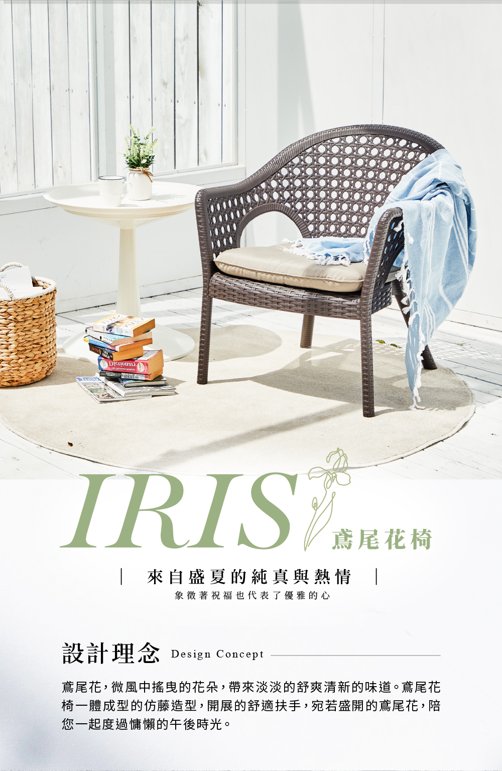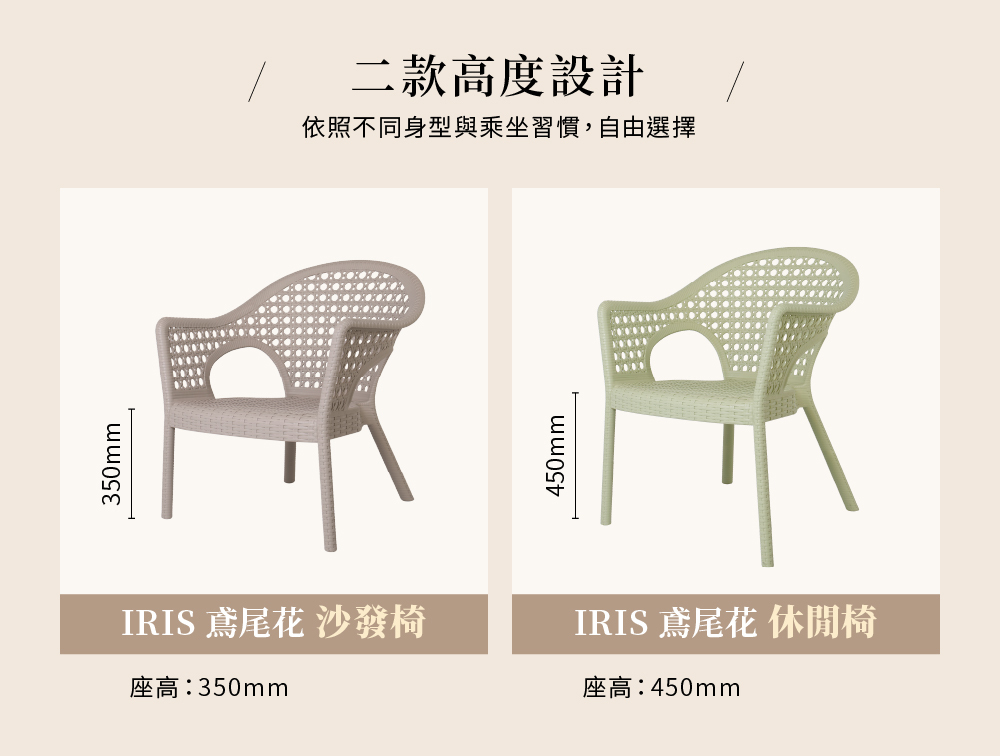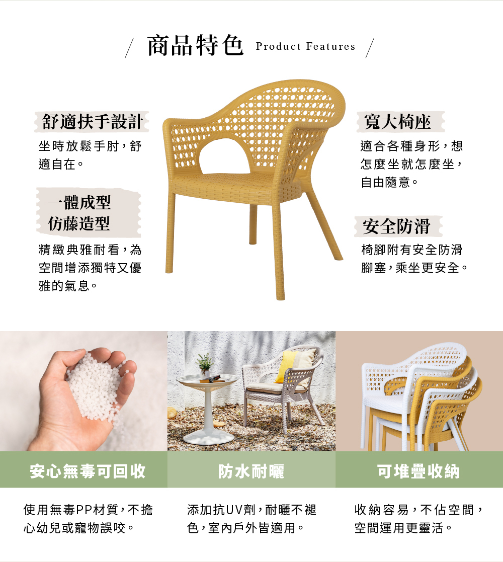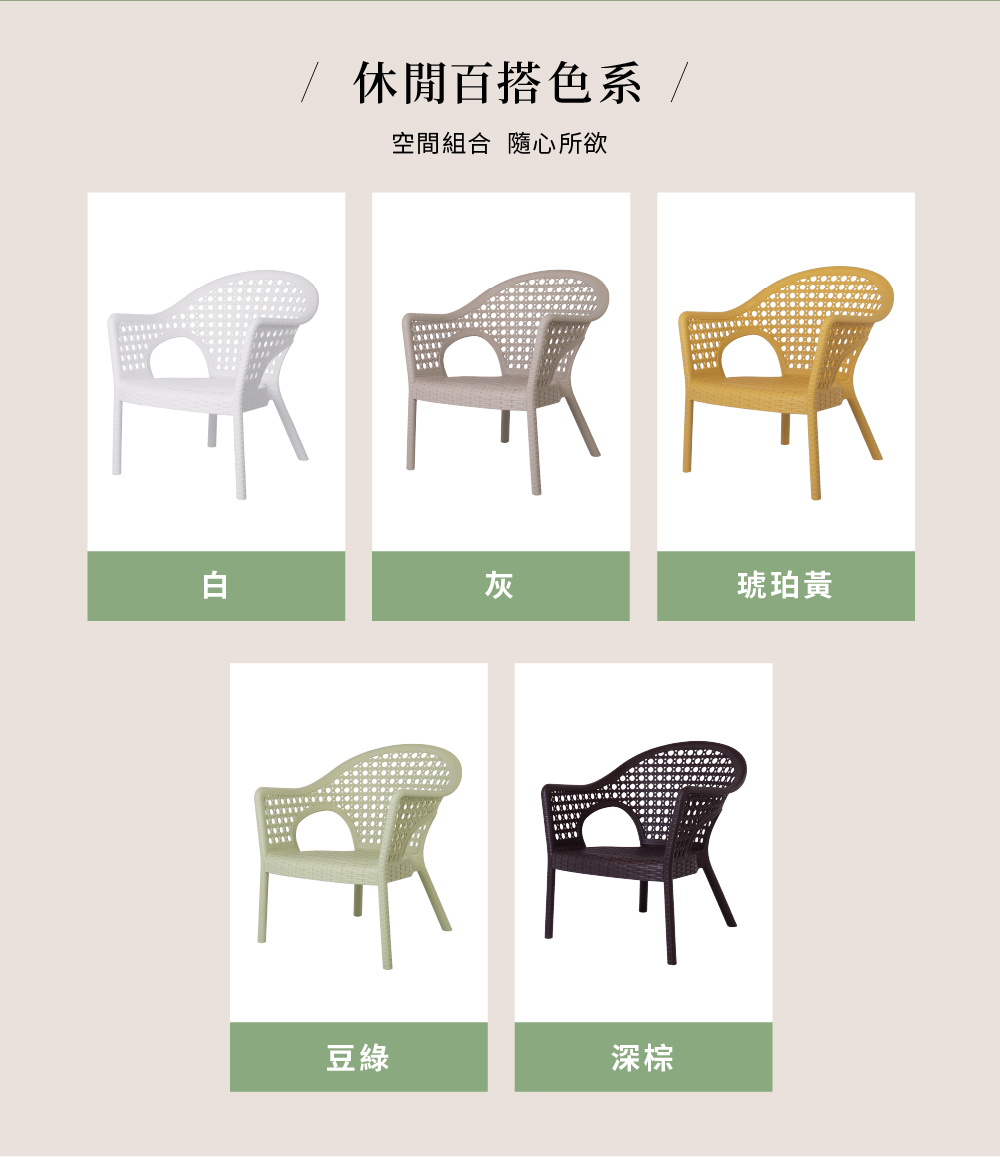 一體成型的仿藤造型風格,典雅耐看。寬大的坐位空間,開展的舒適扶手,是最適合癱軟在其上的椅子,想怎麼坐就怎麼坐,自由隨意!採用PP環保塑料並有抗UV強化,適合戶外空間使用的矮沙發椅。