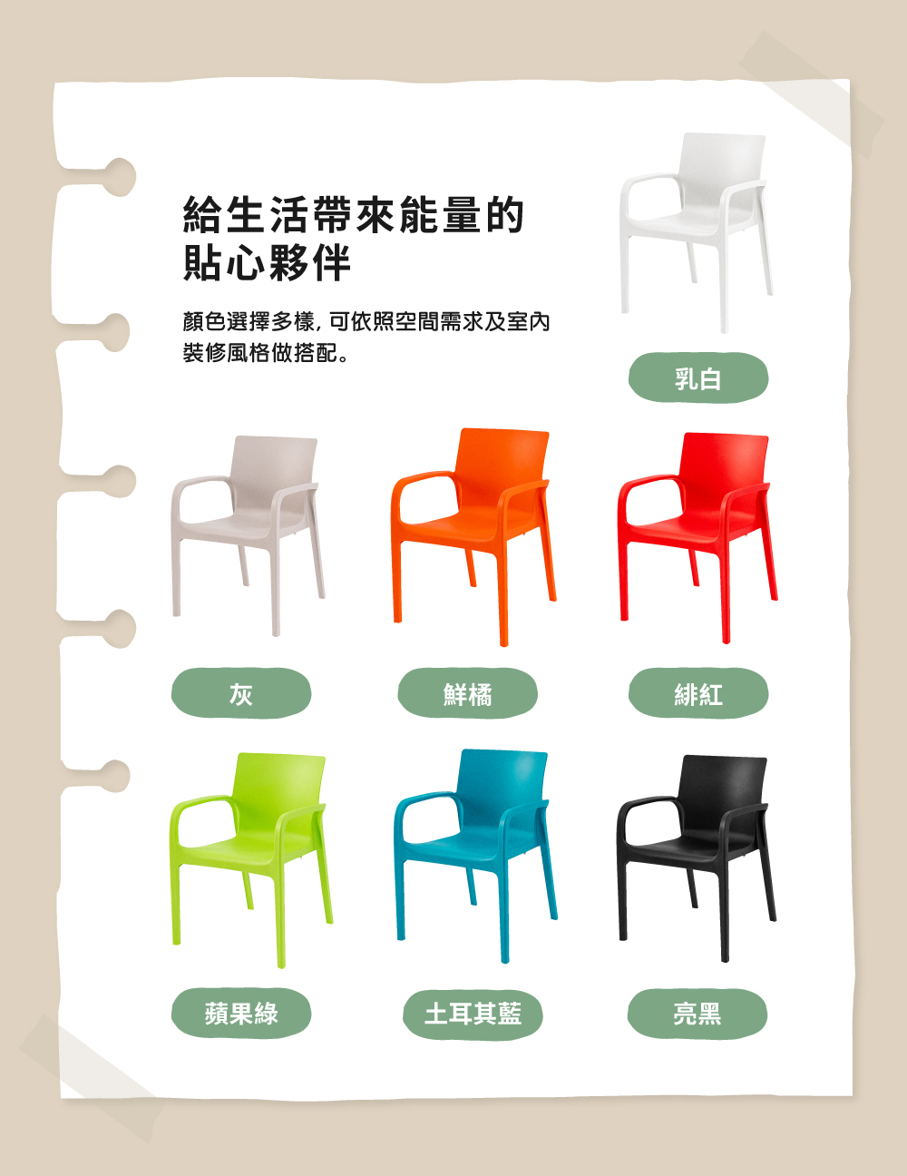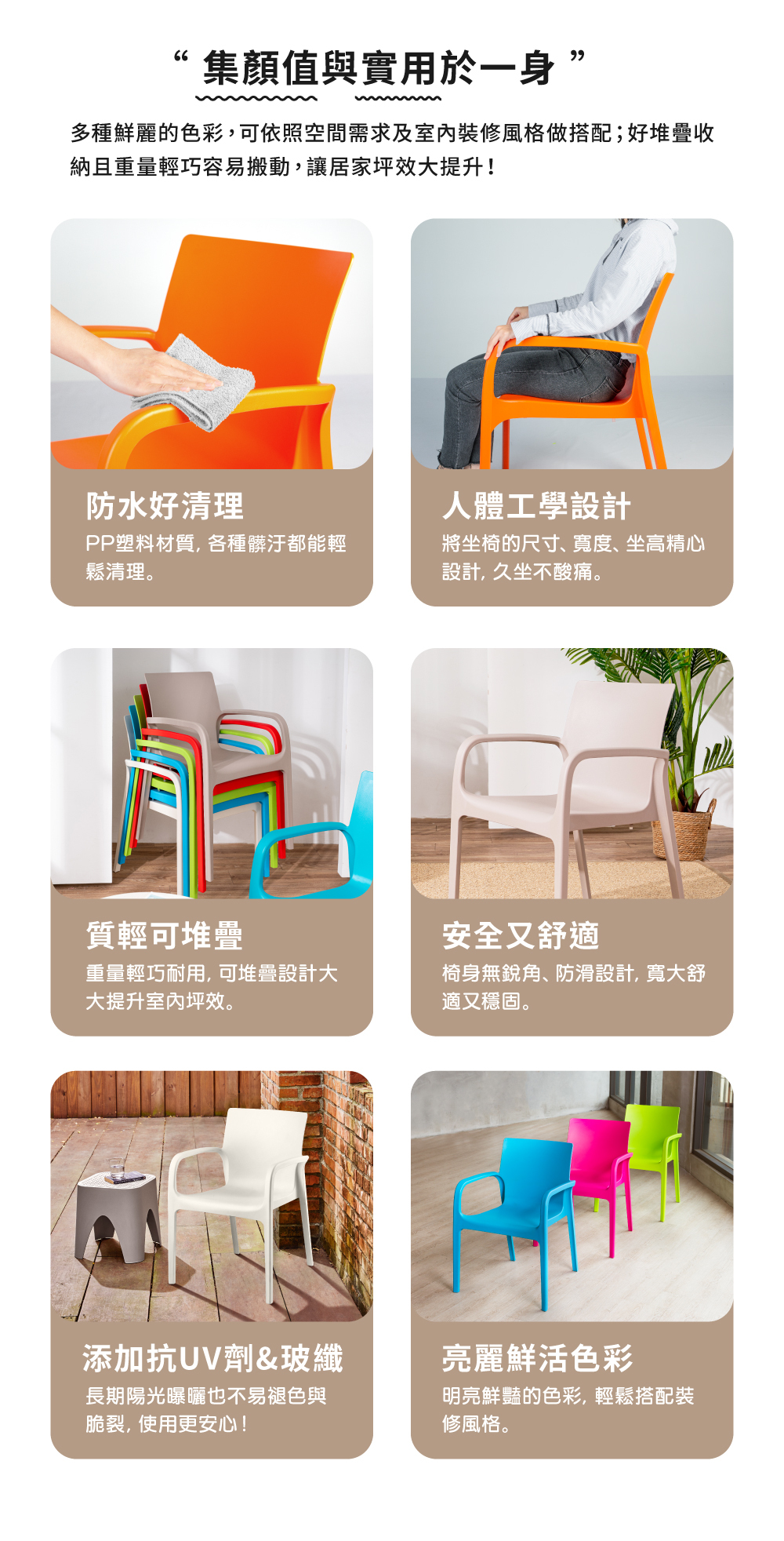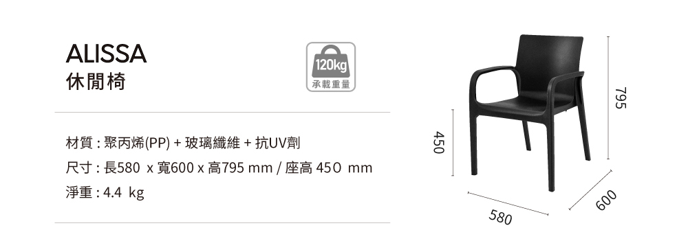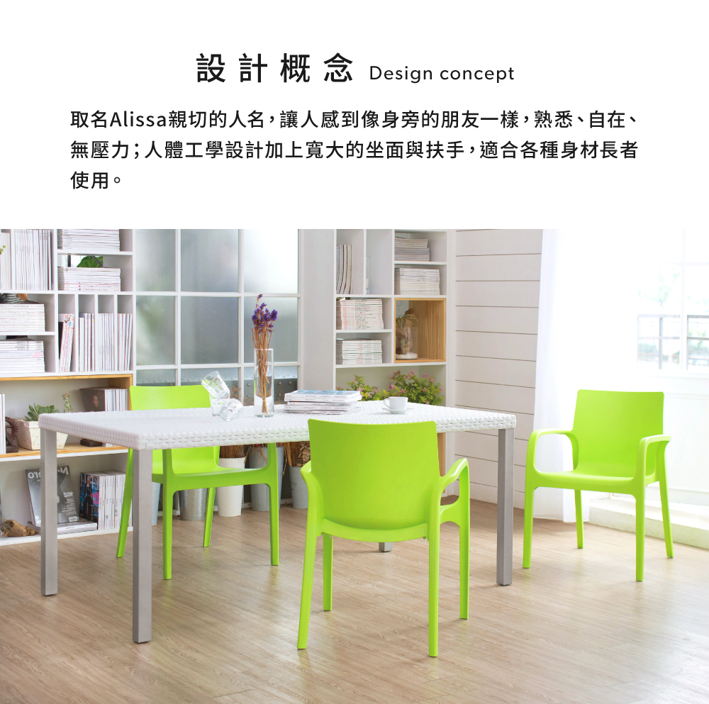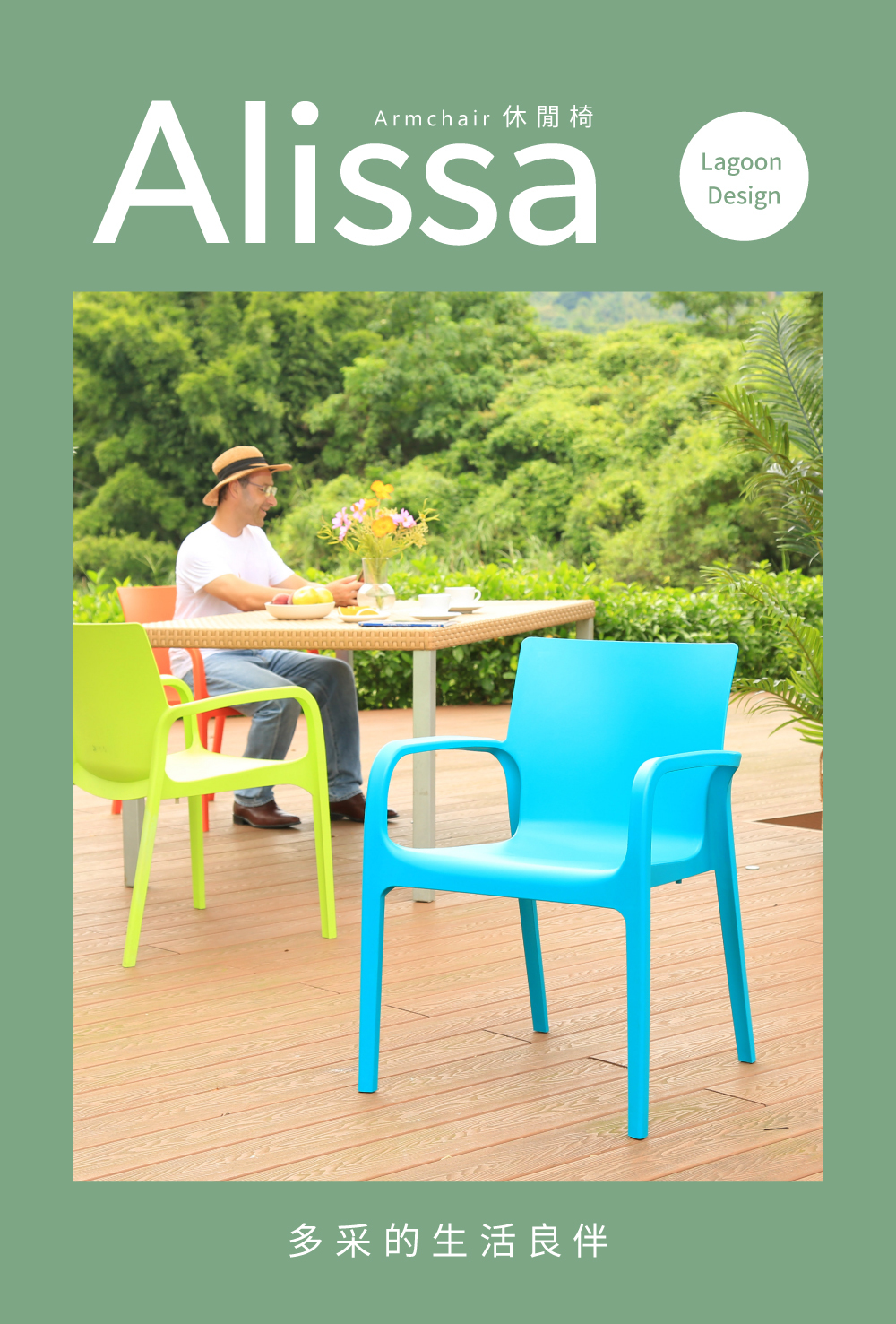 客人號稱最舒適的椅子,人體工學設計加上寬大的坐面與扶手,適合各種身材的人。取名Alissa親切的人名,讓人感到像身旁的朋友一樣,熟悉、自在、無壓力。採用PP環保塑料並有抗UV強化,戶外空間也可以使用的休閒椅。顏色選擇多樣,可依照空間需求及室內裝修風格做搭配。可以疊放收納,居家坪效大提升!