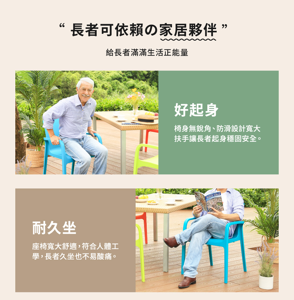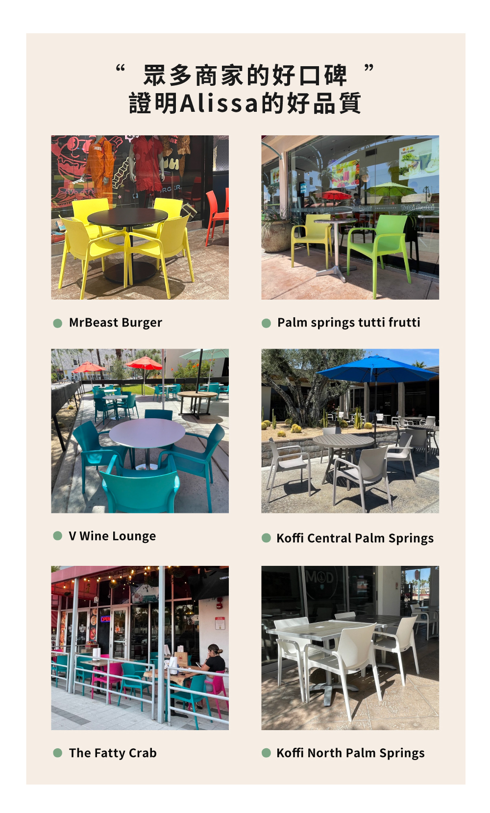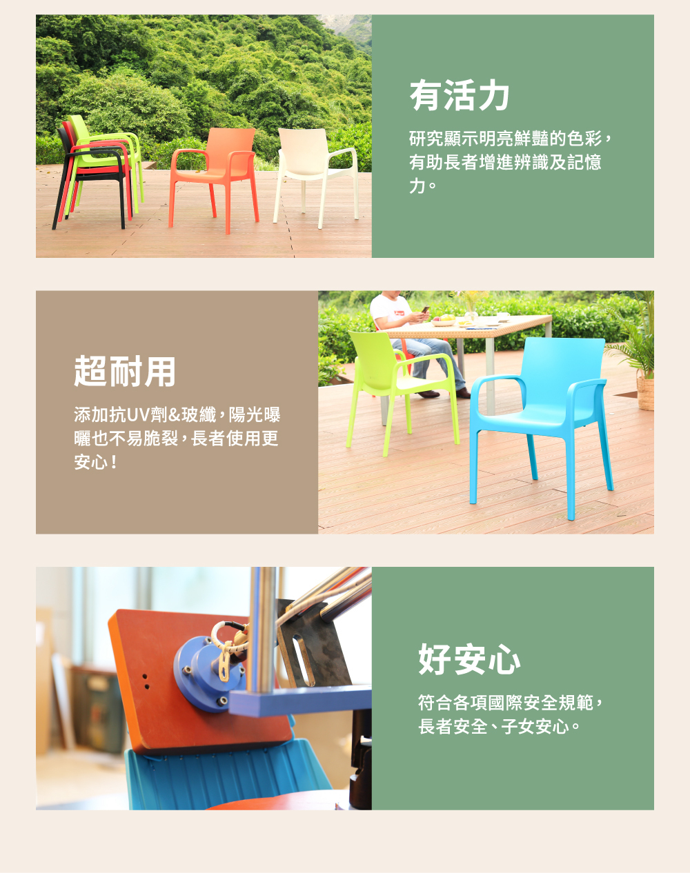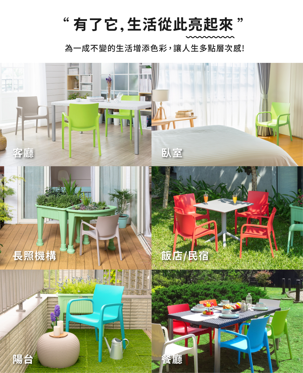 客人號稱最舒適的椅子,人體工學設計加上寬大的坐面與扶手,適合各種身材的人。取名Alissa親切的人名,讓人感到像身旁的朋友一樣,熟悉、自在、無壓力。採用PP環保塑料並有抗UV強化,戶外空間也可以使用的休閒椅。顏色選擇多樣,可依照空間需求及室內裝修風格做搭配。可以疊放收納,居家坪效大提升!