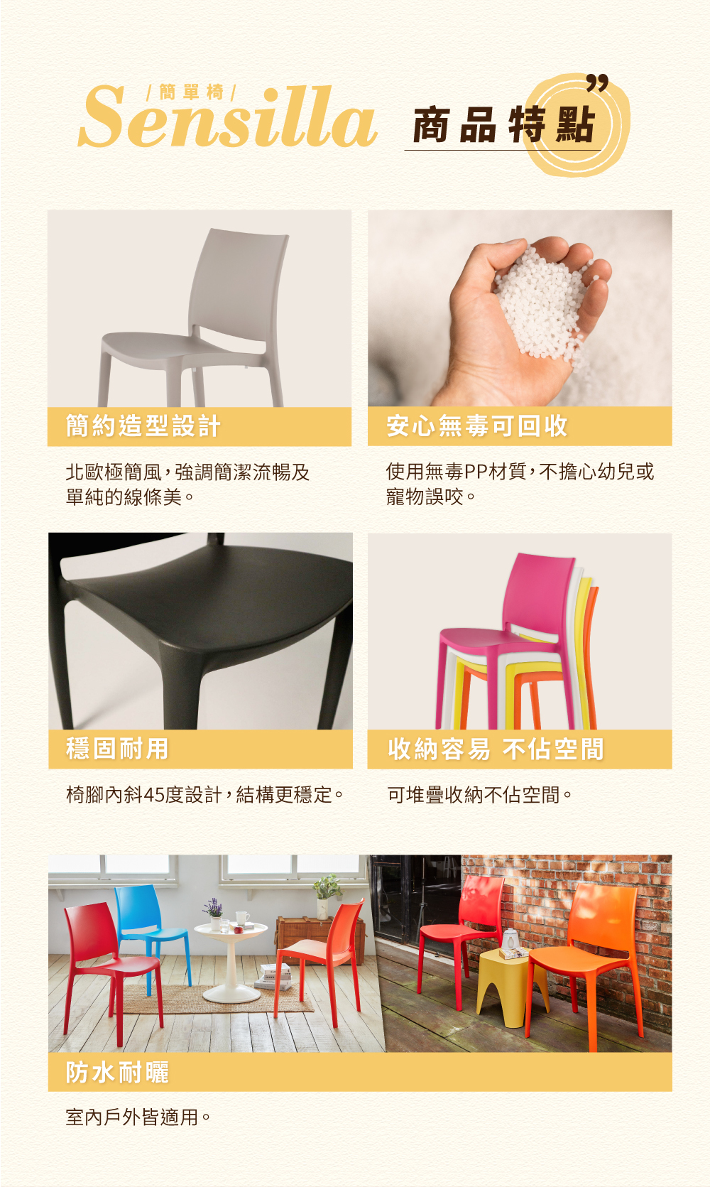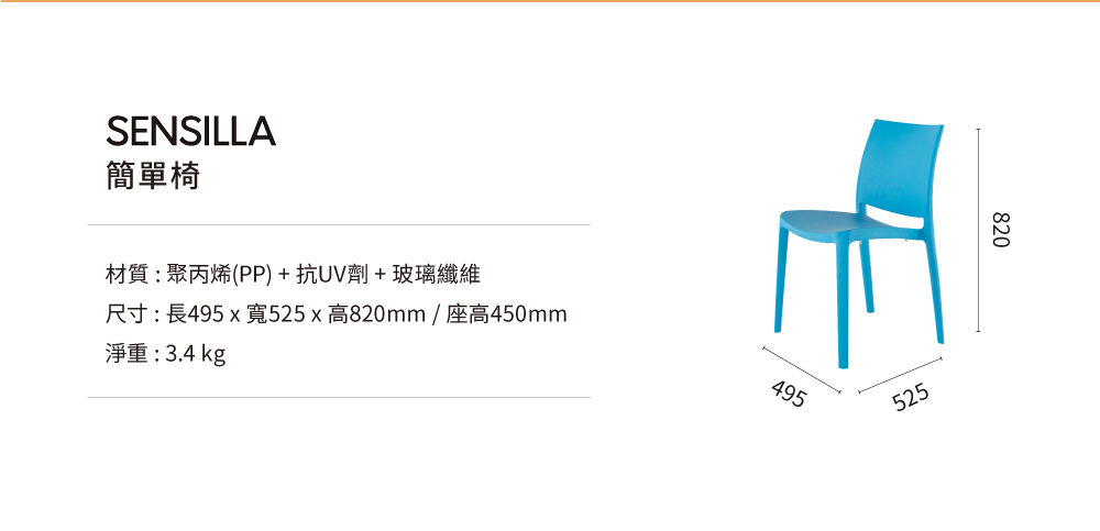 北歐極簡風,強調簡潔流暢及單純的線條美,簡單的設計讓sensilla能夠輕易的融入任何居家環境中。採用PP環保塑料並有抗UV強化,戶外空間也可以使用的椅子。選擇多樣,可依照空間需求及室內裝修風格做搭配。可以疊放收納,居家坪效大提升!