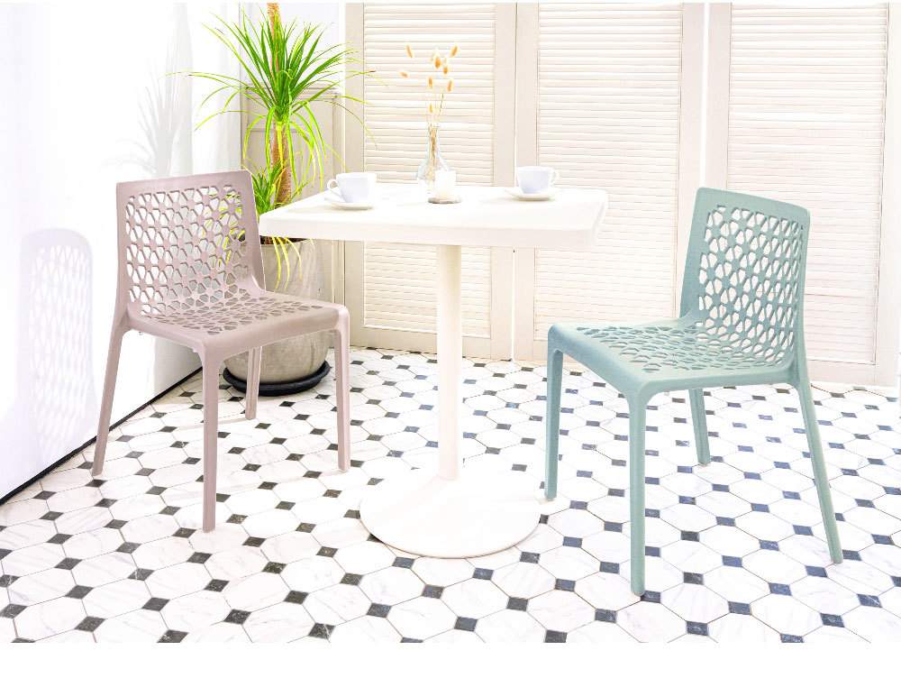 整張椅子充滿活力與動感設計,鏤空圖案讓產品不只跟人互動,也跟環境跟光影互動,透過鏤空產生光影交錯的美,讓產品與空間相呼應。全塑材質搭配添加玻璃纖維,加強椅子鋼性,延長使用壽命不易脆化、環保可回收。可堆疊收納,不占空間。