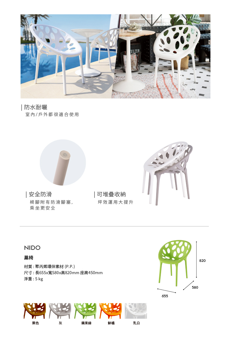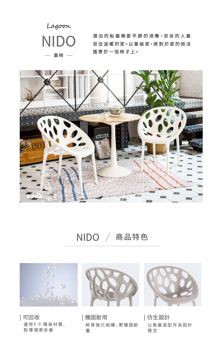 漂泊的船最需要平靜的港灣,流浪的人最思念溫暖的家。 Nido的設計理念是以巢與家的概念,讓椅子成為一個寧靜的避風港。寬大包容的坐椅空間,像是躺在母親的懷抱,給人一種回家的自在與舒適感。椅子外觀的設計時髦又“潮”,不管從正面看或從背面看,椅子的外觀就像一個枝椏包覆的巢。椅面圖案也隱含生生不息的繁衍與傳承,既巢且潮,因此取名巢(潮)椅。