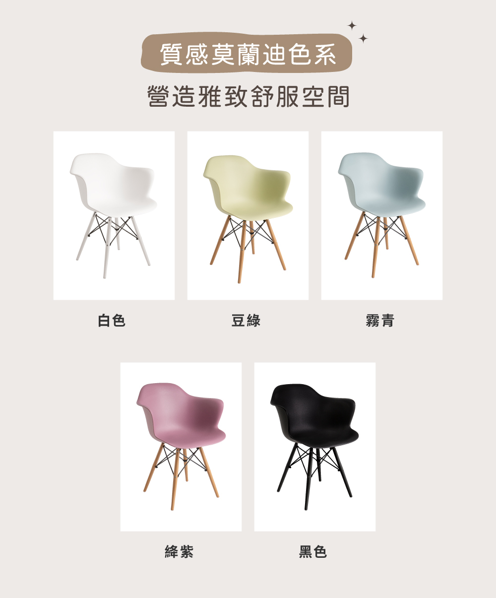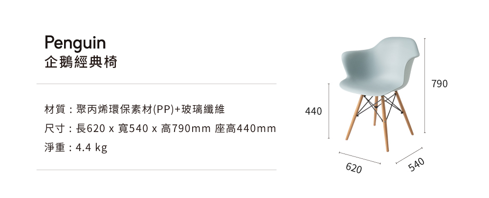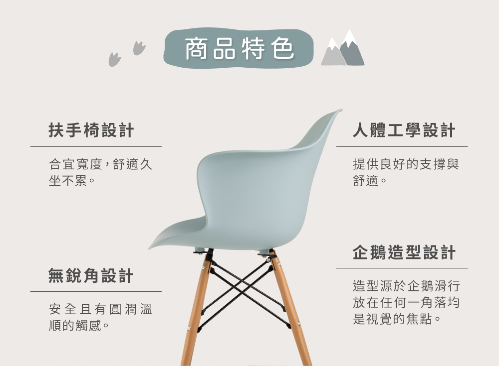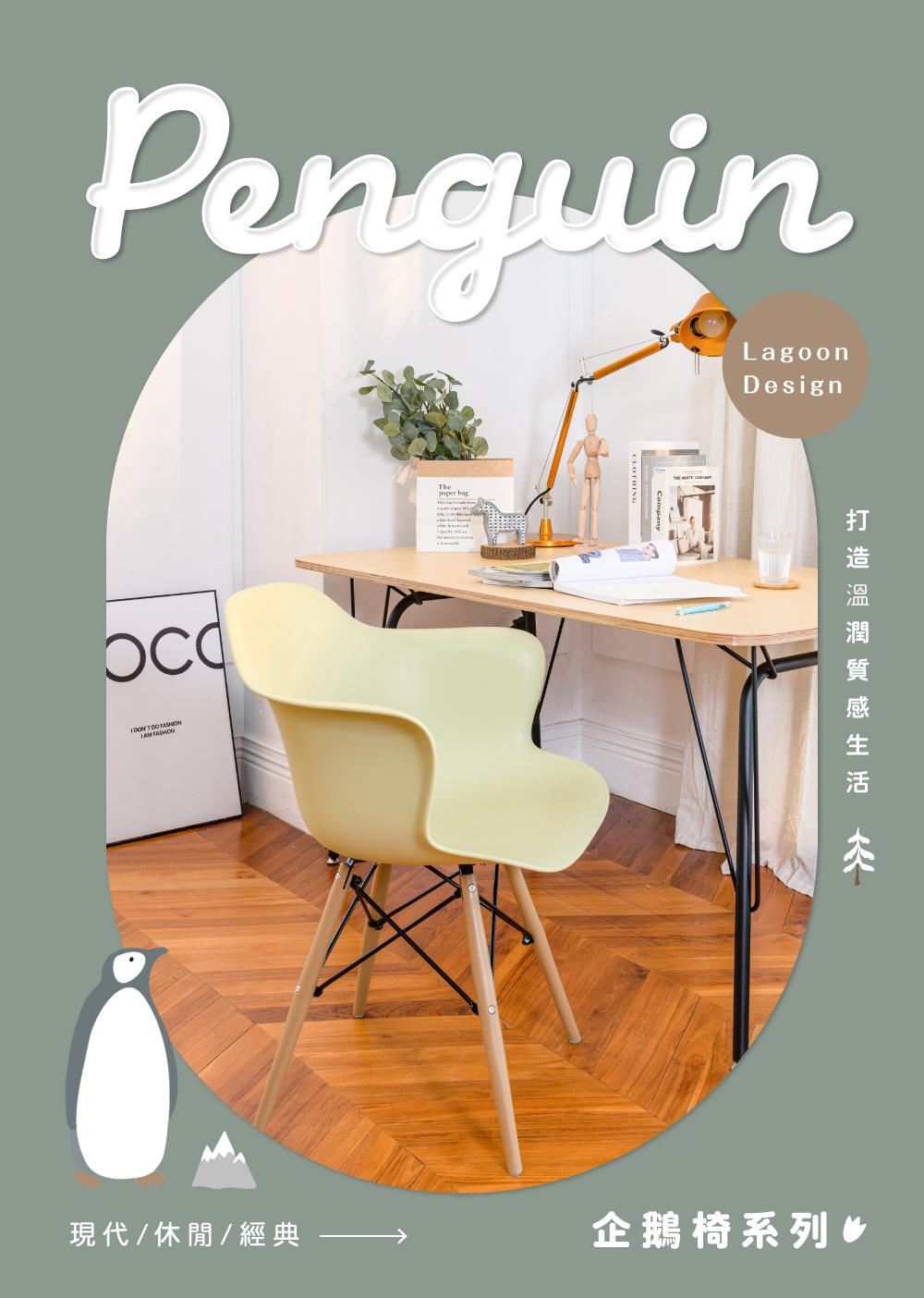 造型源於企鵝滑行,椅側面角度像隻腹部滑行的企鵝,放在任何一 角落,均是視覺的焦點。簡潔圓潤的造型搭配莫蘭迪配色,極具特色與美感,不同椅腳設計可依喜好風格選擇搭配。