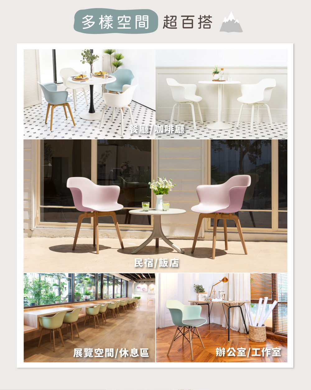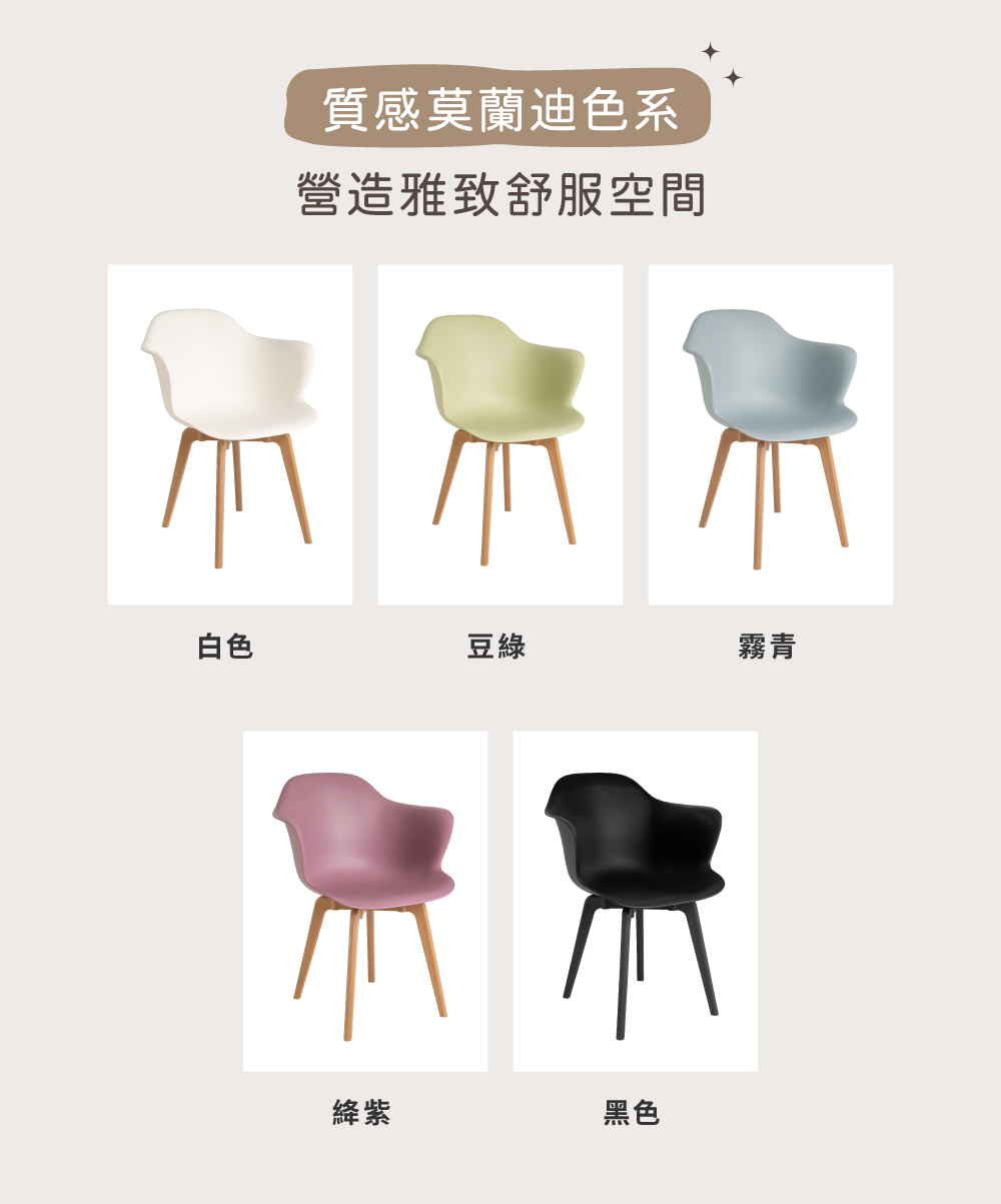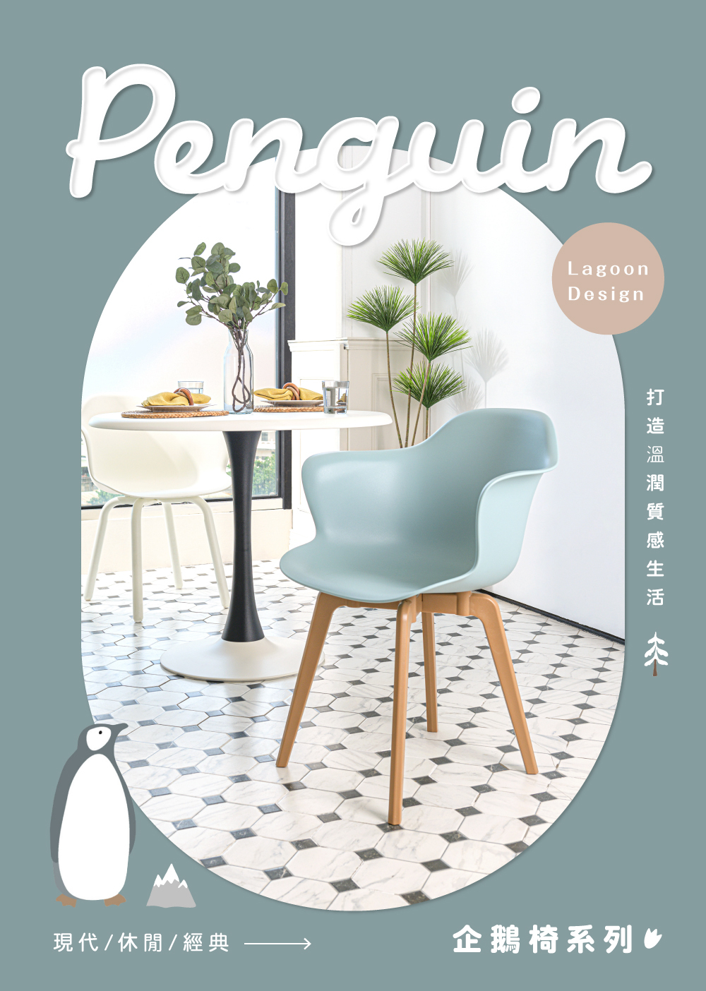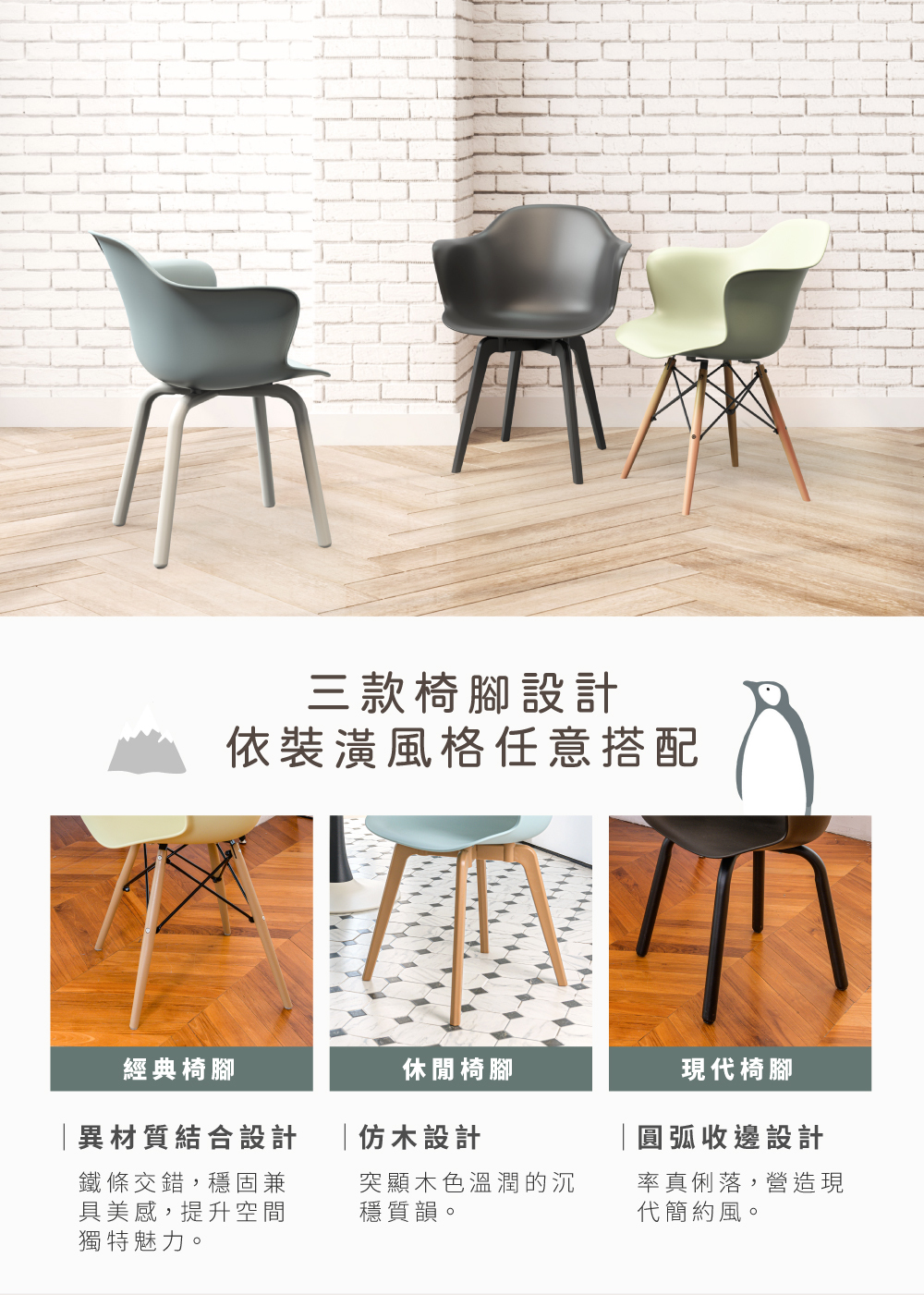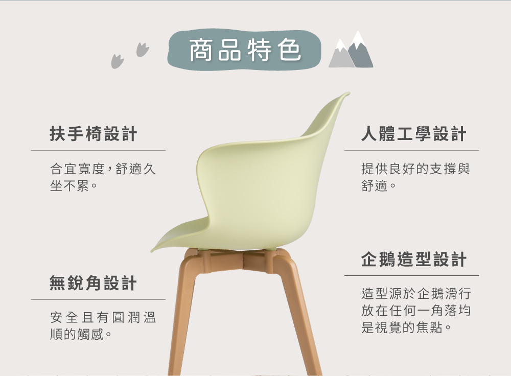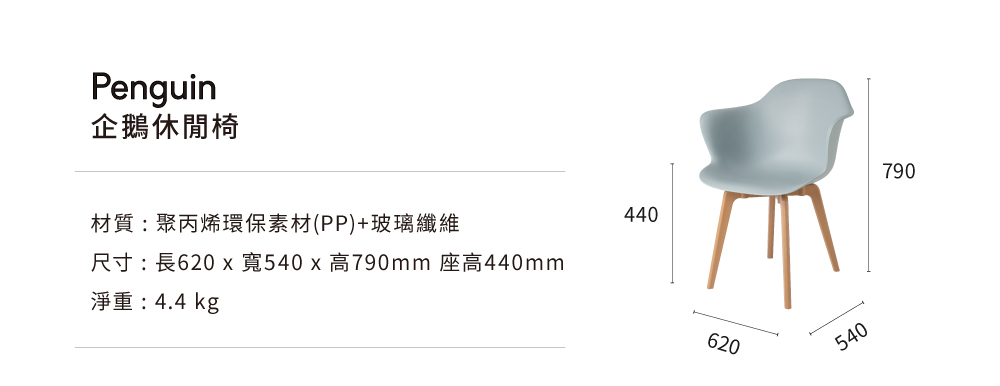 造型源於企鵝滑行,椅側面角度像隻腹部滑行的企鵝,放在任何一 角落,均是視覺的焦點。簡潔圓潤的造型搭配莫蘭迪配色,極具特色與美感,不同椅腳設計可依喜好風格選擇搭配。