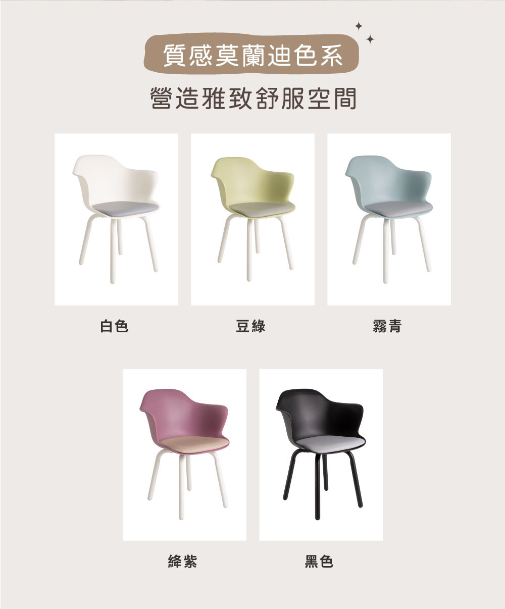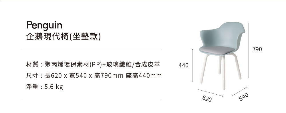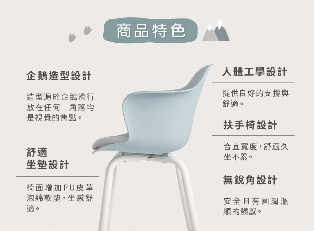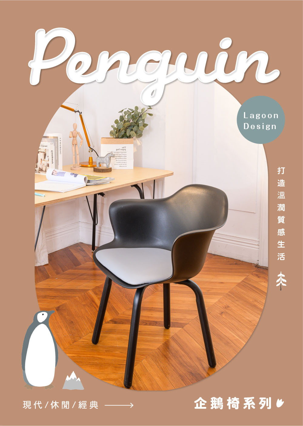 造型源於企鵝滑行,椅側面角度像隻腹部滑行的企鵝,放在任何一 角落,均是視覺的焦點。簡潔圓潤的造型搭配莫蘭迪配色,極具特色與美感,不同椅腳設計可依喜好風格選擇搭配。