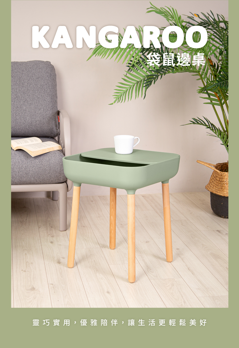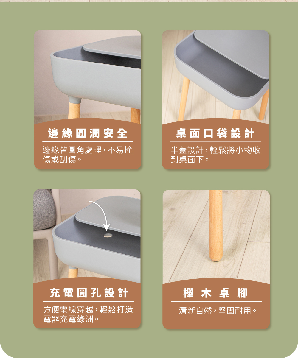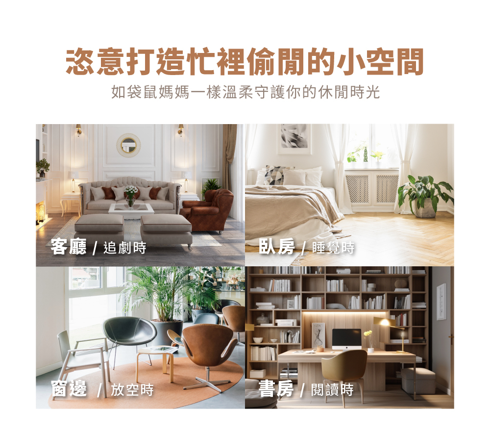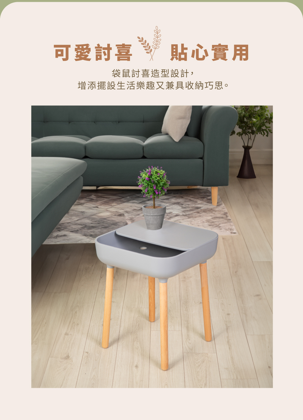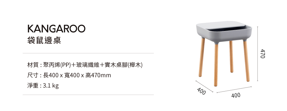 如袋鼠媽媽的口袋設計,造型討喜,讓雜亂小物可以像小袋鼠一樣輕鬆收納到桌子裡,不會堆在桌面顯得環境雜亂,讓角落都能點綴一抹精緻與舒適。