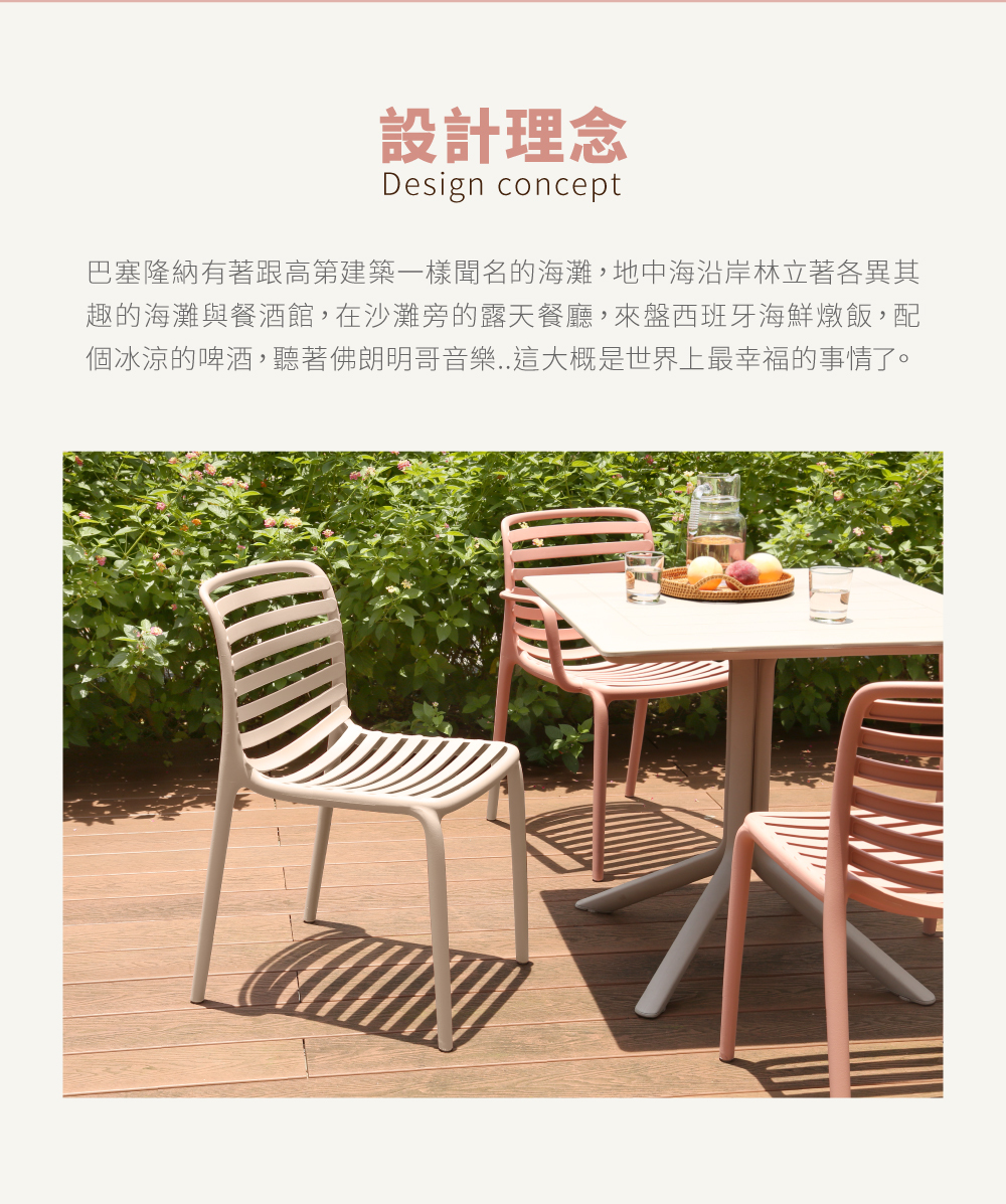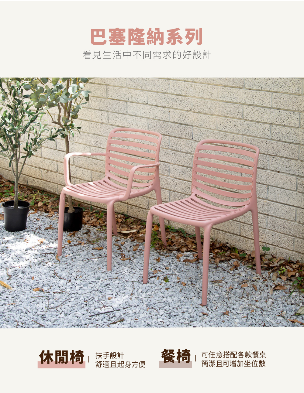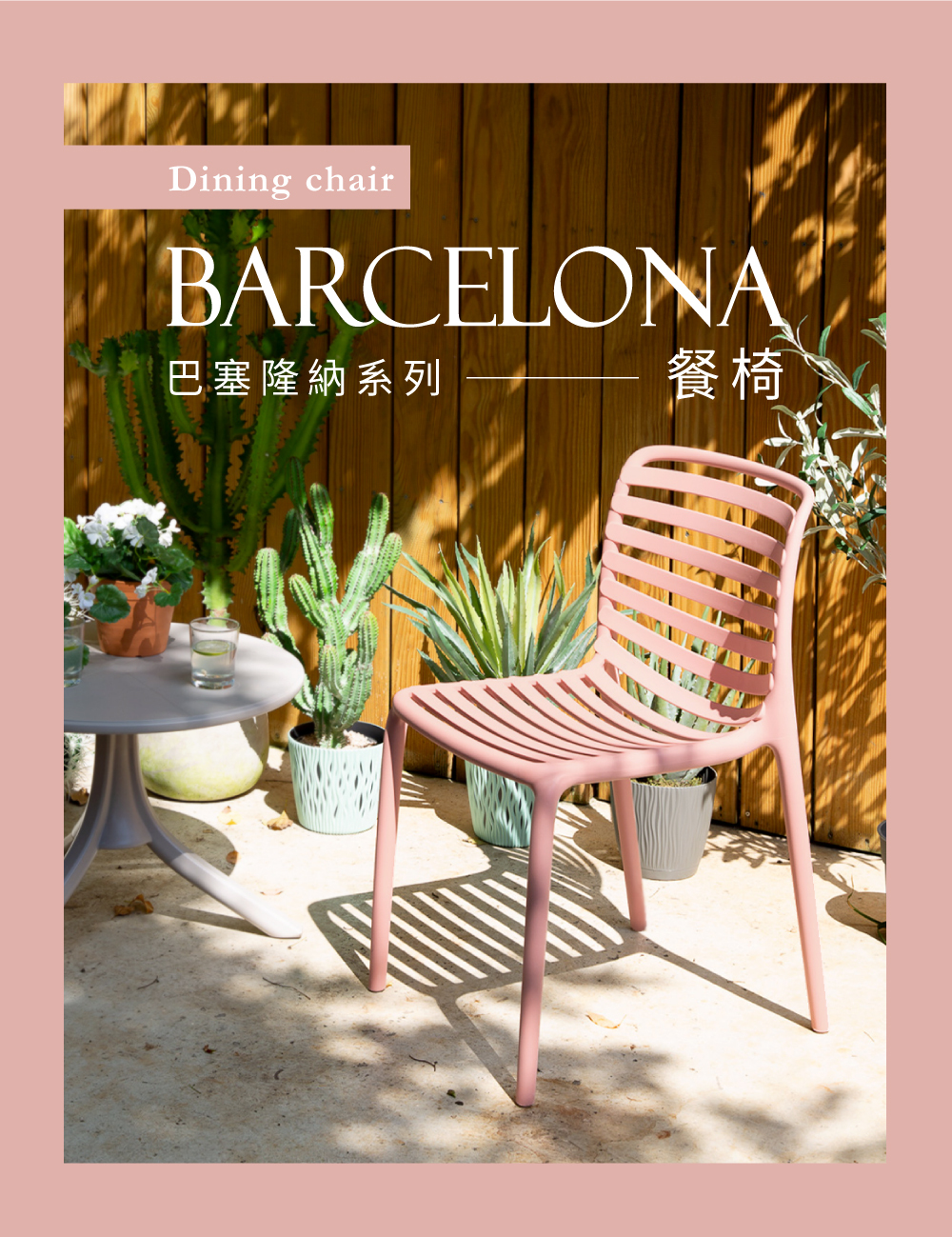 巴塞隆納餐椅優雅的線條,防水抗 UV 材質,非常適合戶外餐酒館及陽台庭院使用,享受美食、美景,一同感受地中海的悠閒風情。簡約的造型,空間好搭配。