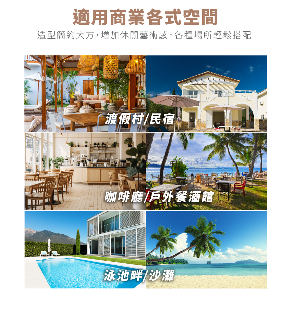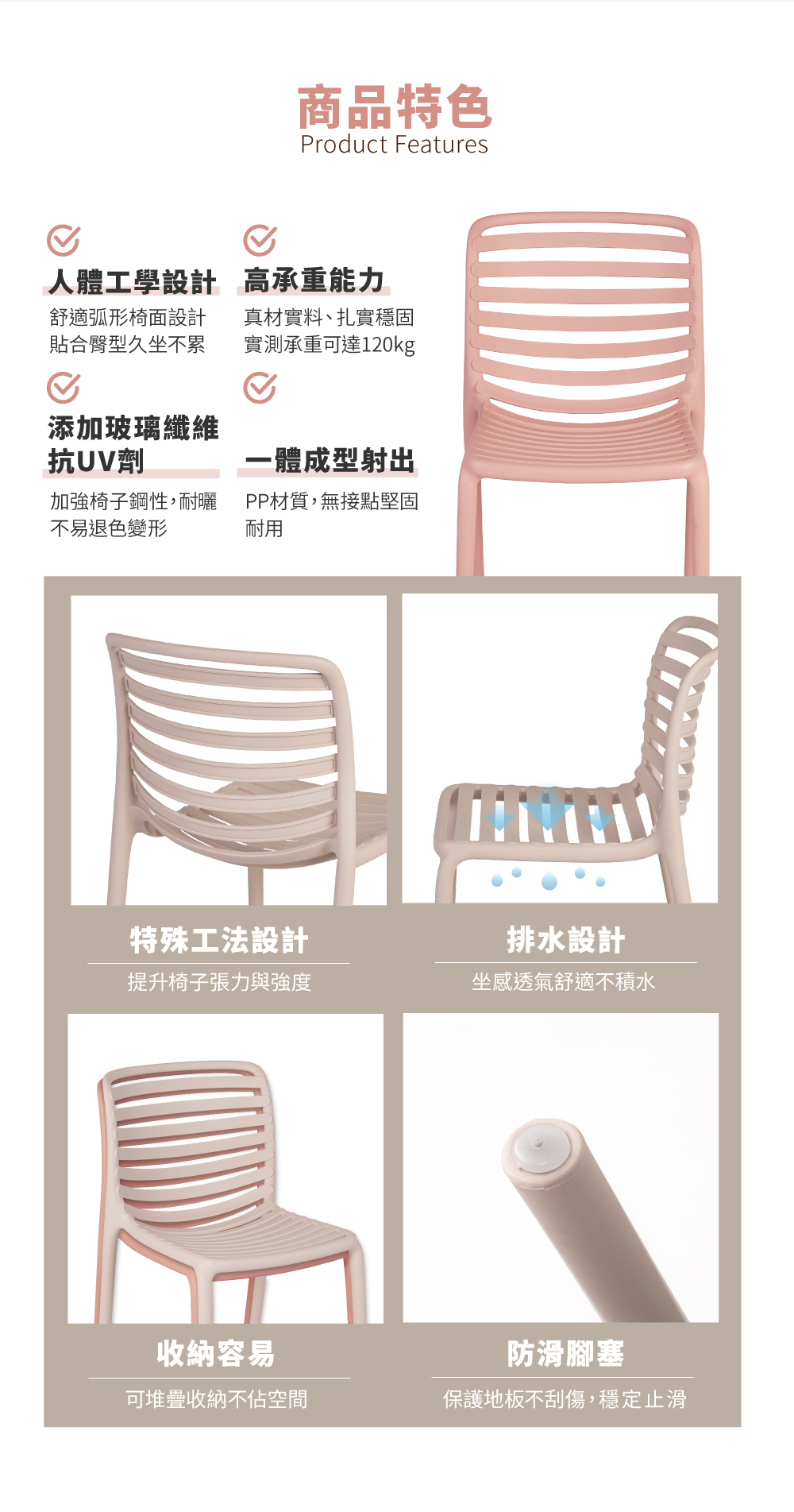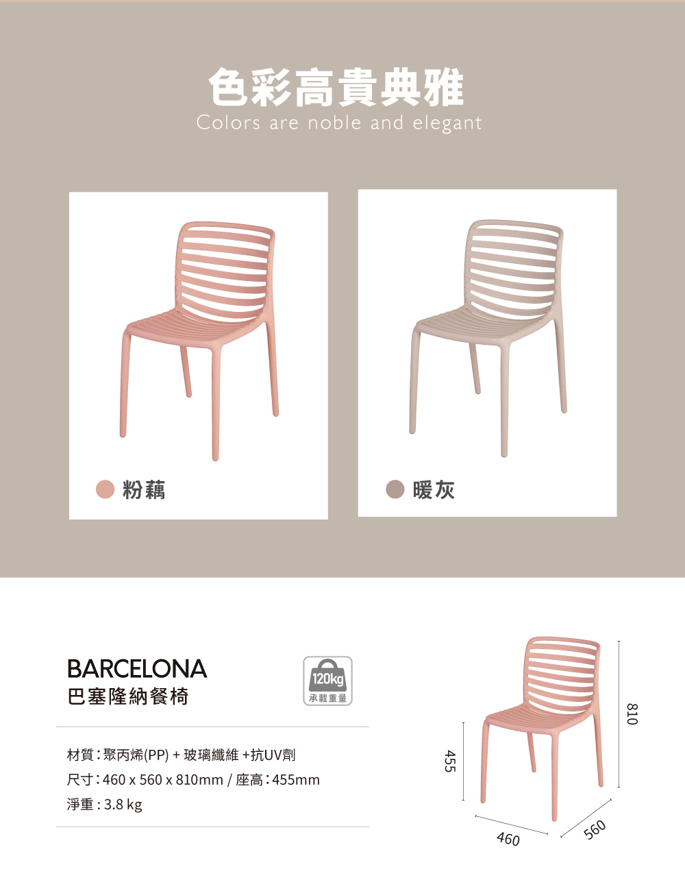 巴塞隆納餐椅優雅的線條,防水抗 UV 材質,非常適合戶外餐酒館及陽台庭院使用,享受美食、美景,一同感受地中海的悠閒風情。簡約的造型,空間好搭配。