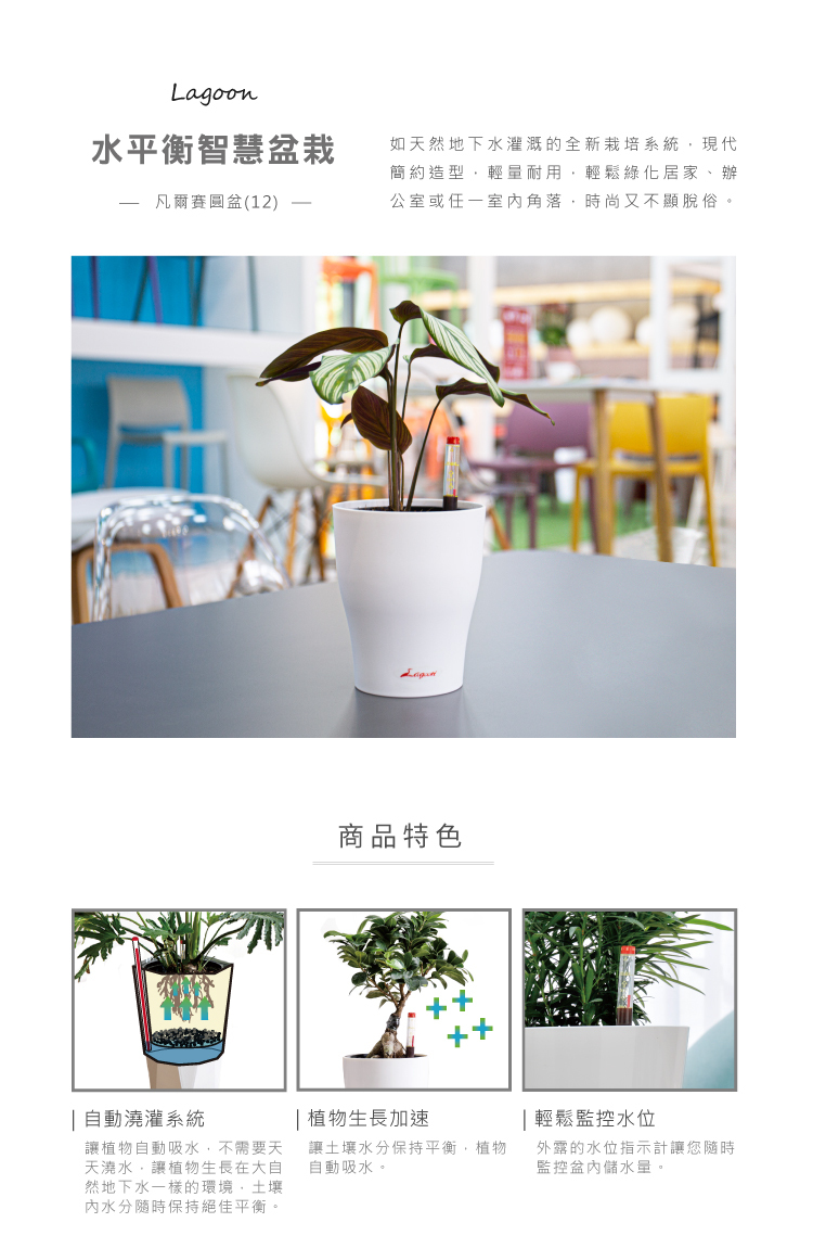 如天然地下水灌溉的全新栽培系統,現代簡約造型,輕量耐用,輕鬆綠化居家、辦公室或任一室內角落。