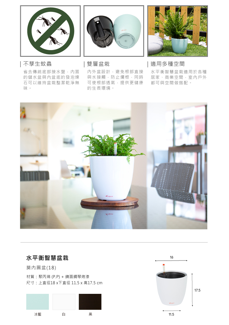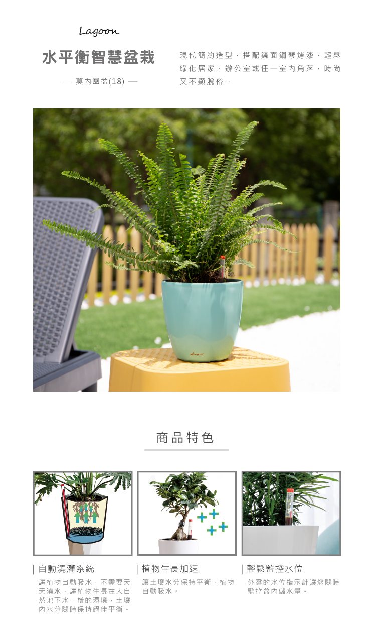 如天然地下水灌溉的全新栽培系統,現代簡約造型,輕量耐用,輕鬆綠化居家、辦公室或任一室內角落。