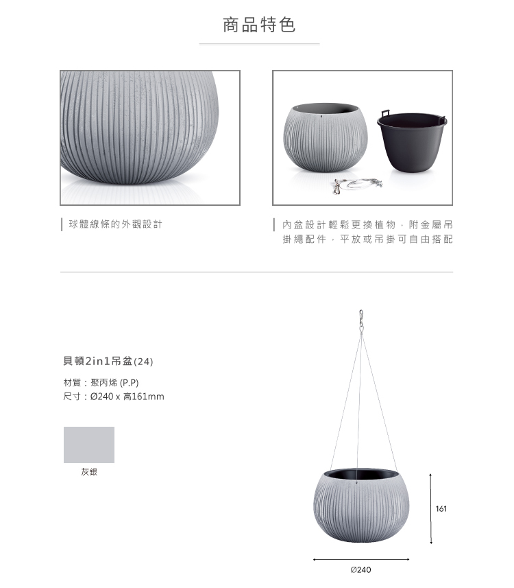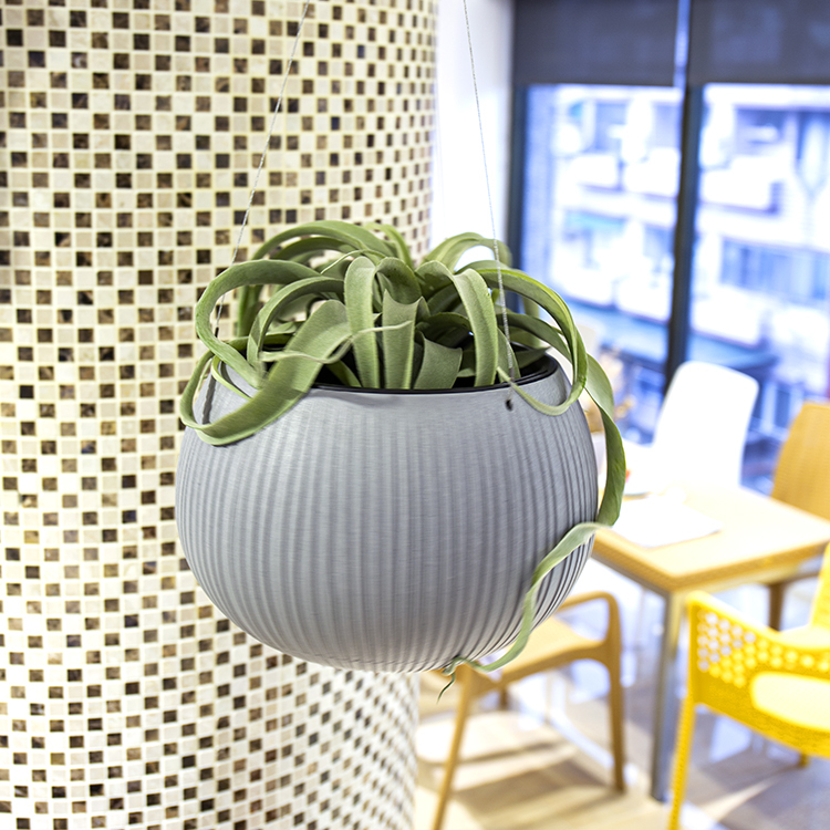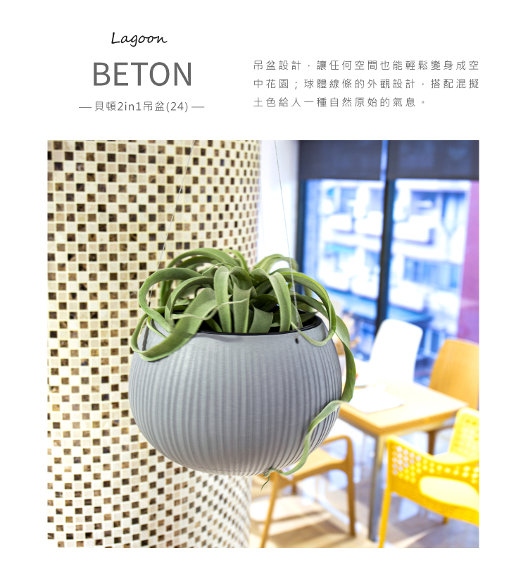 吊盆設計,讓任何空間也能輕鬆變身成空中花園;球體線條的外觀設計,搭配混擬土色給人一種自然原始的氣息.