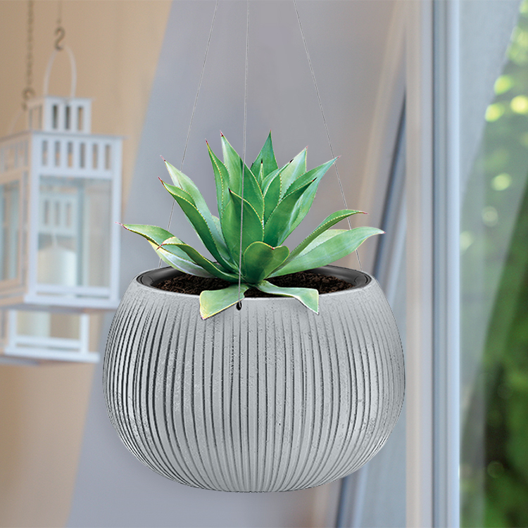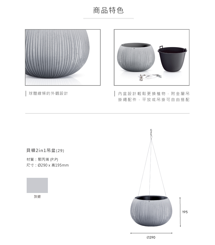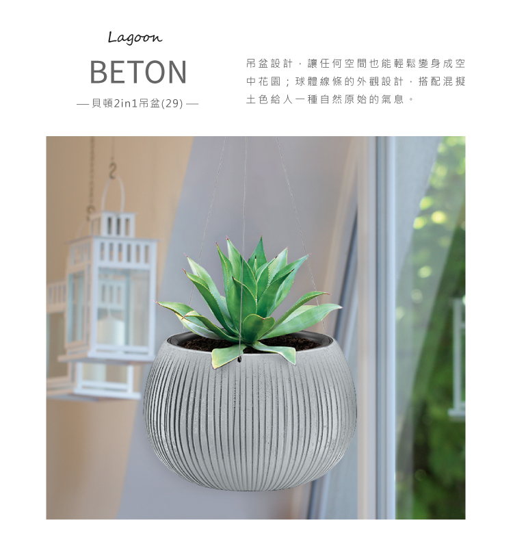 吊盆設計,讓任何空間也能輕鬆變身成空中花園;球體線條的外觀設計,搭配混擬土色給人一種自然原始的氣息.