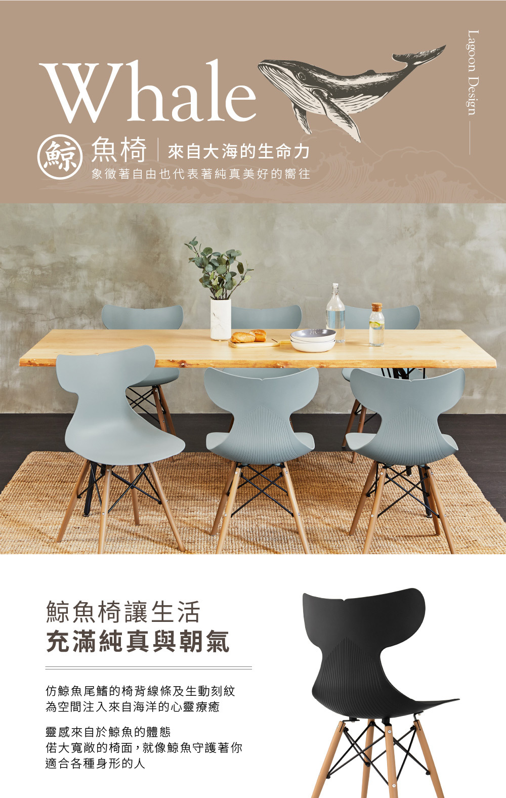 造型源於鯨魚的image,簡潔的設計,能和諧的融入環境中。偌大無局限的椅面,適合各種體型的人。人體工學考量的椅背,提供良好的支撐與舒適感,彈性的設計讓靠背不會硬幫幫,久坐不累。