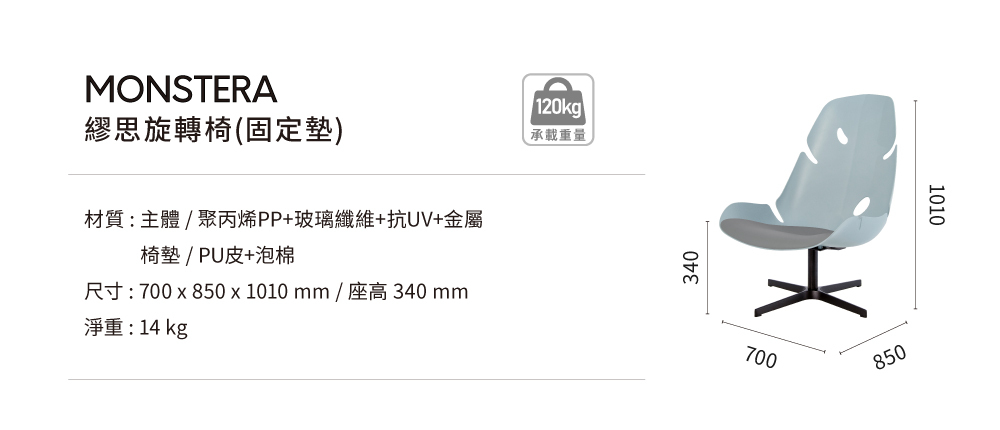 繆思椅造型元素取自Monstera;葉片形態豐富,從葉緣不規則的羽裂到狹橢圓穿孔特點為設計重點。搭配大面積底座空間如置身大自然般舒適自在。旋轉時自由靈動的優雅,為休閒空間創造出不一樣的清新氣象。