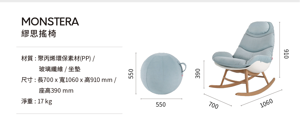 繆思椅造型元素取自Monstera;葉片形態豐富,從葉緣不規則的羽裂到狹橢圓穿孔特點為設計重點。搭配大面積親膚坐墊如置身大自然般舒適自在。搖椅搖曳時影影綽綽生氣勃勃;為居家空間創造出不一樣的清新氣象。