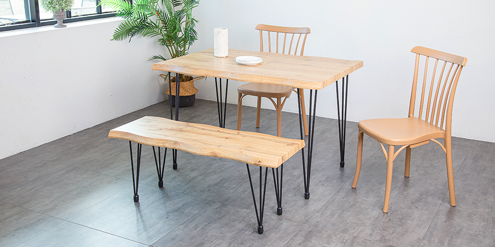輕工業風的長凳腳設計 ,搭配 4cm 超厚桌板加上優雅曲邊設計,簡潔又不失變化。金屬鐵腳結構佳,增加強度 。
