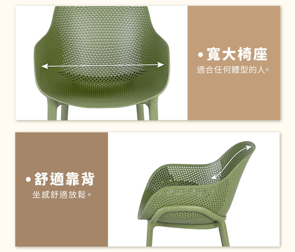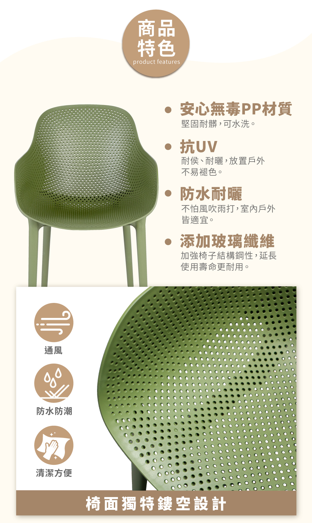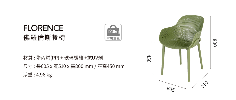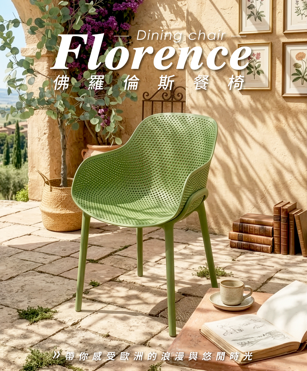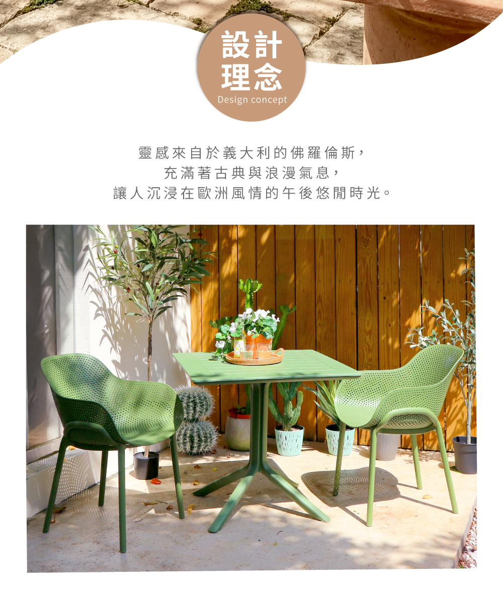 這款餐椅的設計靈感來自於義大利的佛羅倫斯,充滿著古典與浪漫的氣息,讓人沉浸在歐洲的風情的午後悠閒時光。造型簡單大方,寛大座面有扶手設計,增加休閒舒適感,各種場合輕鬆搭配。添加抗 UV 劑,提升耐候、耐曬性能,放置戶外不易褪色。
