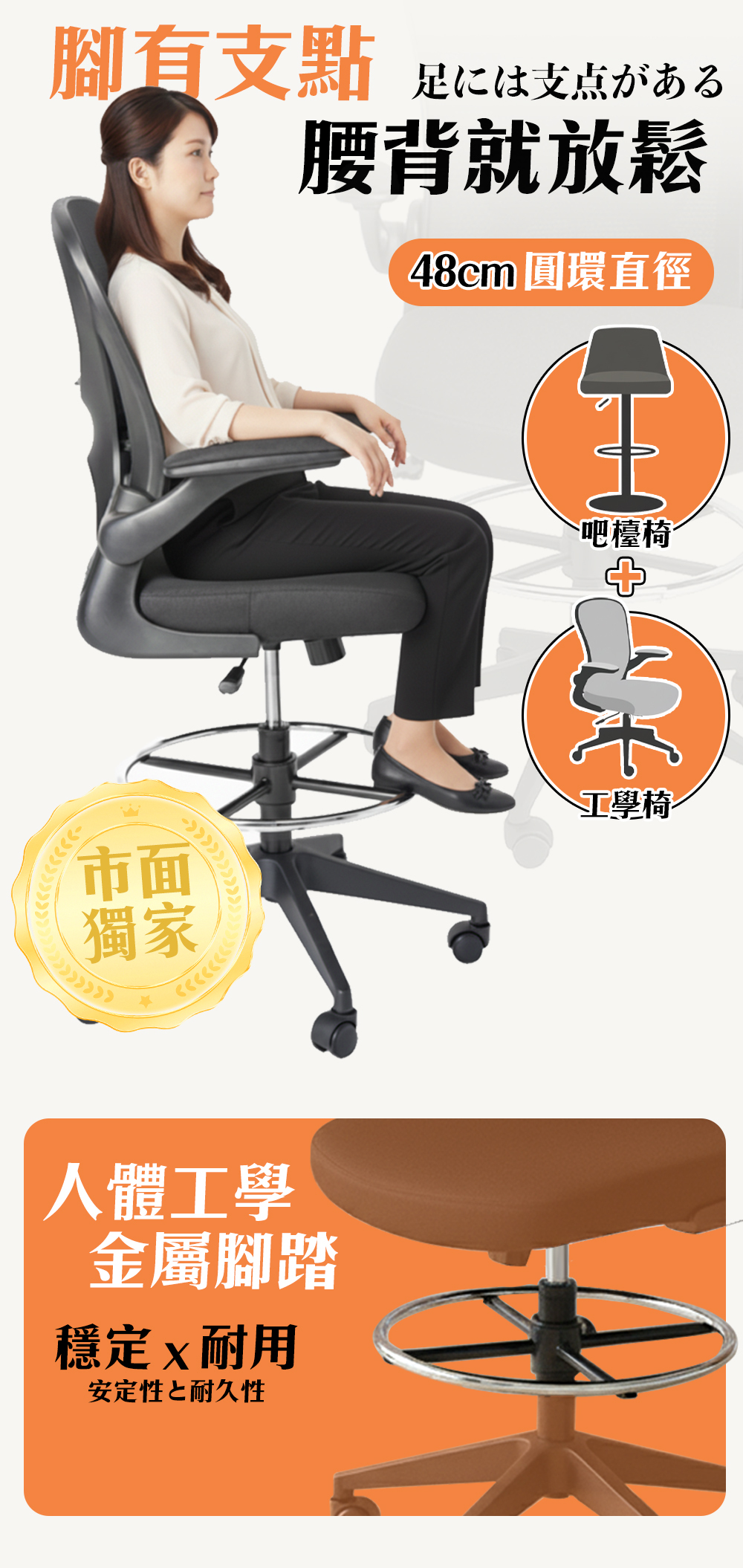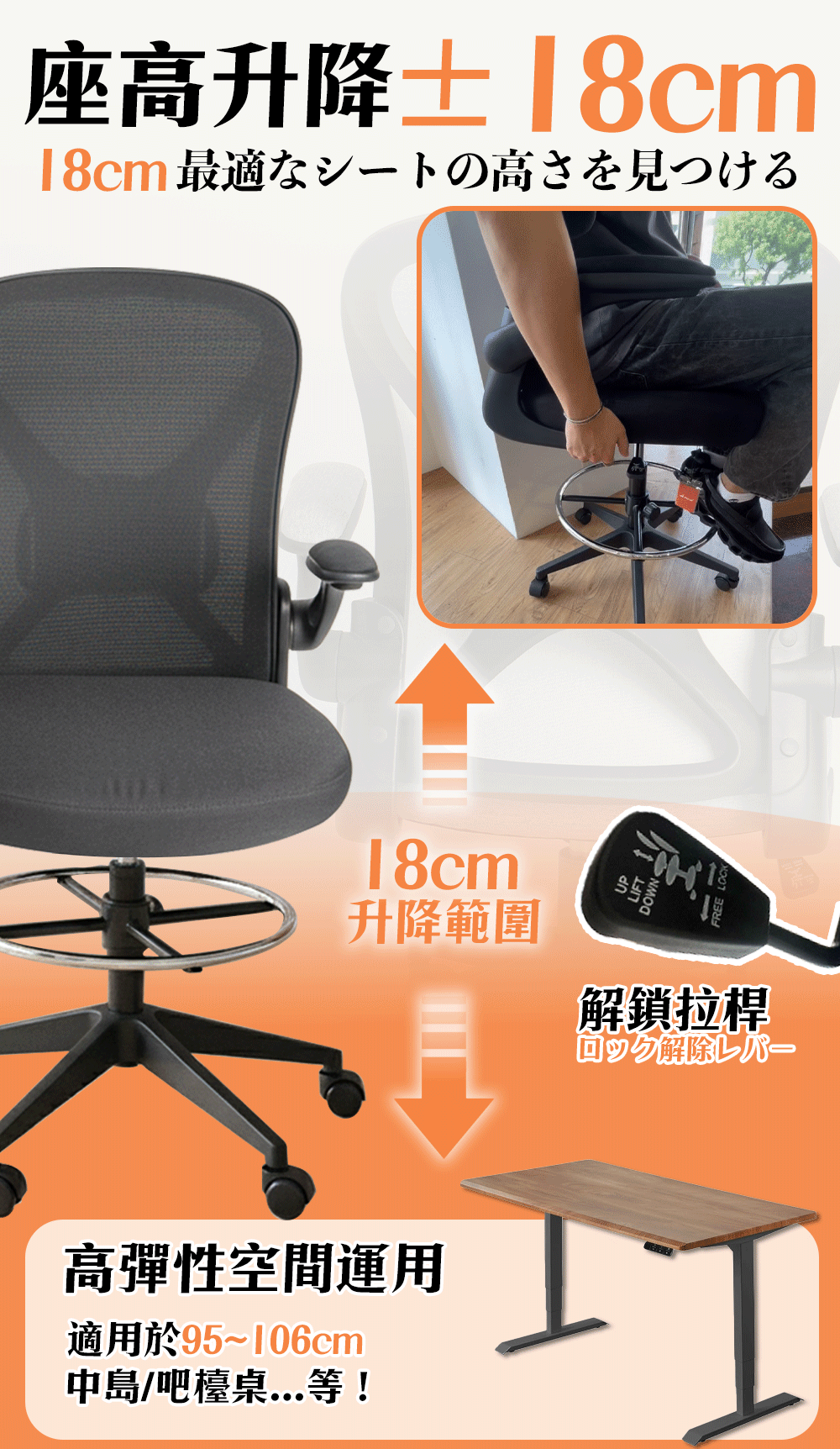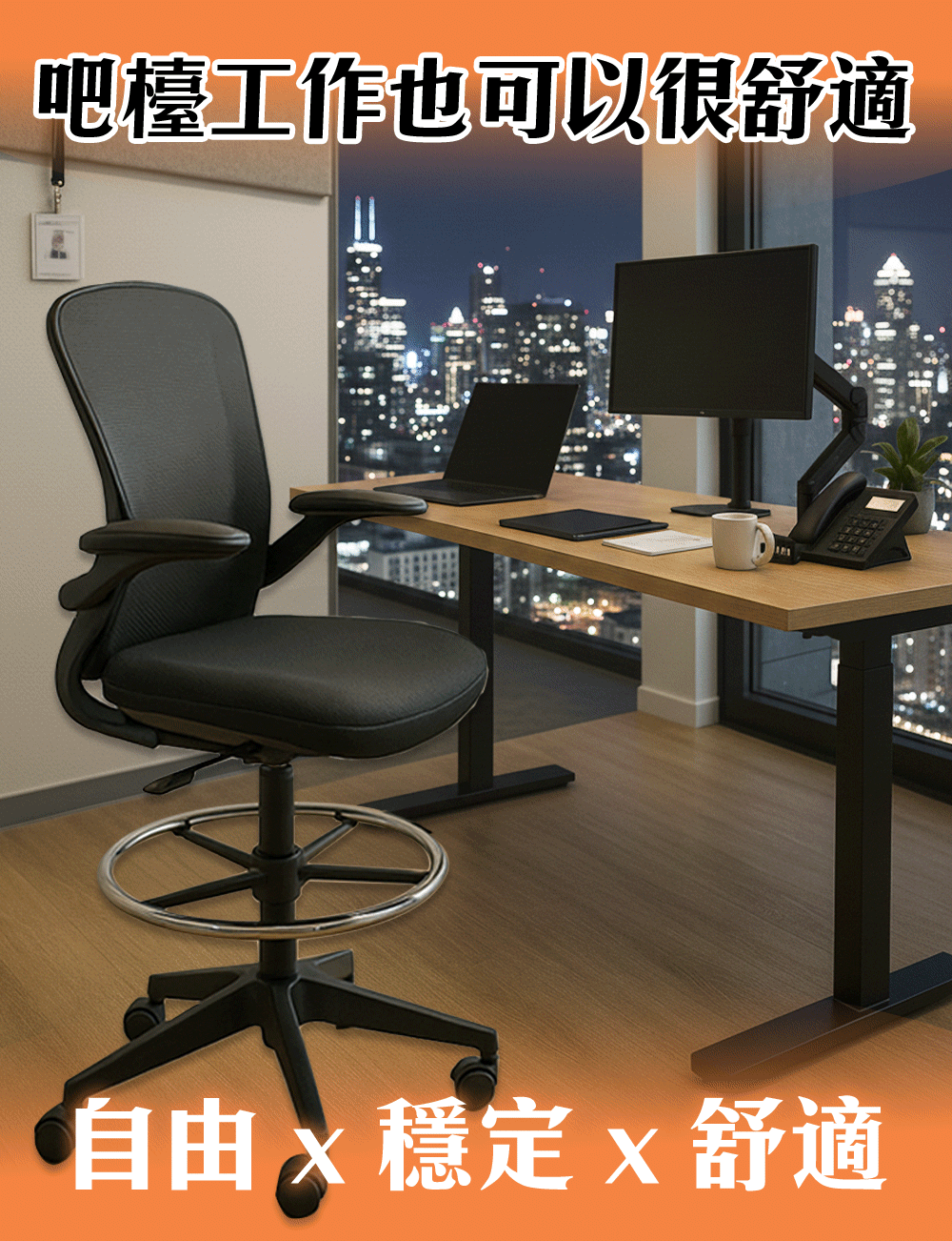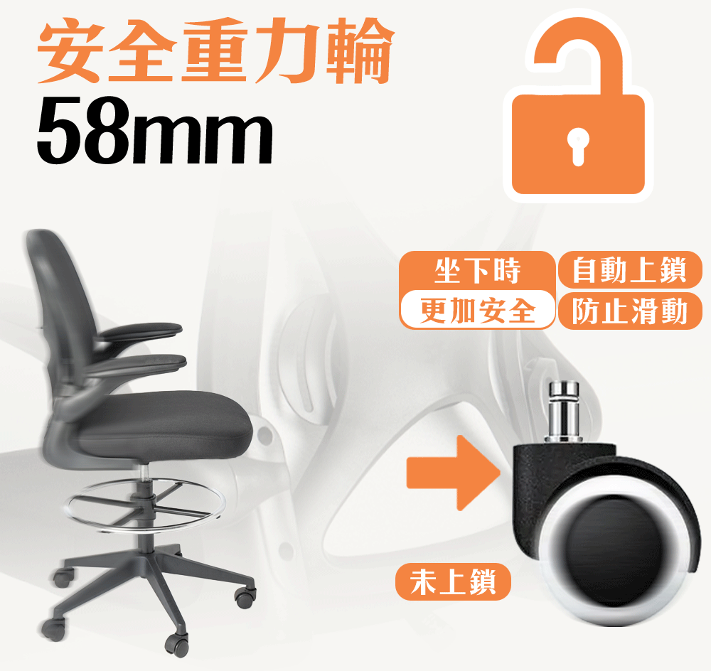 最舒服的設計,支撐你久坐的需求,高腳椅也能成為日常的舒適選擇。適用於 95-106cm 中島/吧檯桌面。安全重力輪設計,坐下時即自動鎖定,上下椅更穩定與安全性。