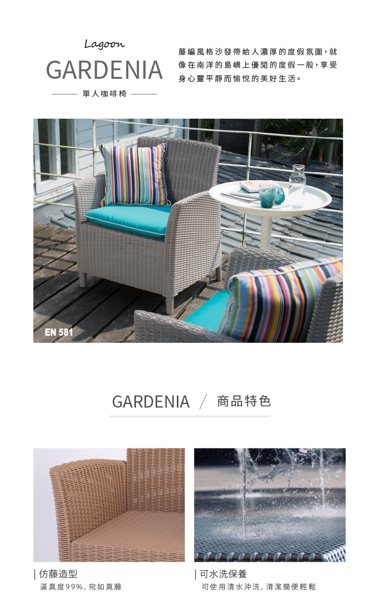 Gardenia(梔子花)強調材質的經久耐用,如同花語的永恆與一生守候,椅子造型曲線擷取梔子花側面線條,搭配真實感十足的圓藤,休閒浪漫的風格。有一句話說美麗的綻放之後總是藏著巨大的堅持,Lagoon創新藤編傢俱堅持著品質,堅持著設計,堅持著創新來延續傳統手工藤編精神,在不同環境中展現不同的姿態,綻放優雅氣息,傳遞分享著愉悅陽光的氣息。採用環保塑料材質加上抗UV強化,搭配戶外款坐墊便可以在室外空間使用,經得起日曬雨淋的休閒風沙發!椅腳高度有兩種規格,矮款為沙發,高款為咖啡椅,坐高相差3公分,可依空間及使用需求自由搭配。