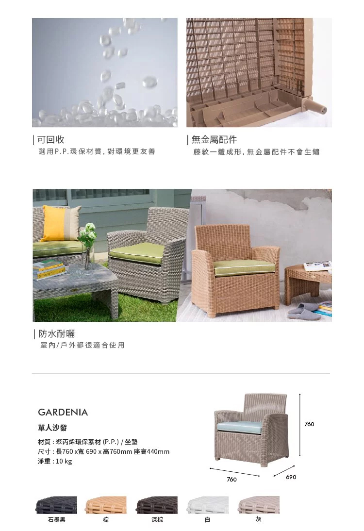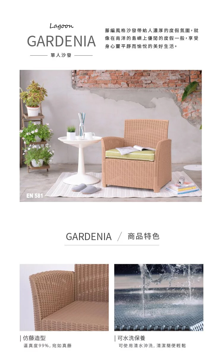 Gardenia(梔子花)強調材質的經久耐用,如同花語的永恆與一生守候,椅子造型曲線擷取梔子花側面線條,搭配真實感十足的圓藤,休閒浪漫的風格。有一句話說美麗的綻放之後總是藏著巨大的堅持,Lagoon創新藤編傢俱堅持著品質,堅持著設計,堅持著創新來延續傳統手工藤編精神,在不同環境中展現不同的姿態,綻放優雅氣息,傳遞分享著愉悅陽光的氣息。採用環保塑料材質加上抗UV強化,搭配戶外款坐墊便可以在室外空間使用,經得起日曬雨淋的休閒風沙發!椅腳高度有兩種規格,矮款為沙發,高款為咖啡椅,坐高相差3公分,可依空間及使用需求自由搭配。