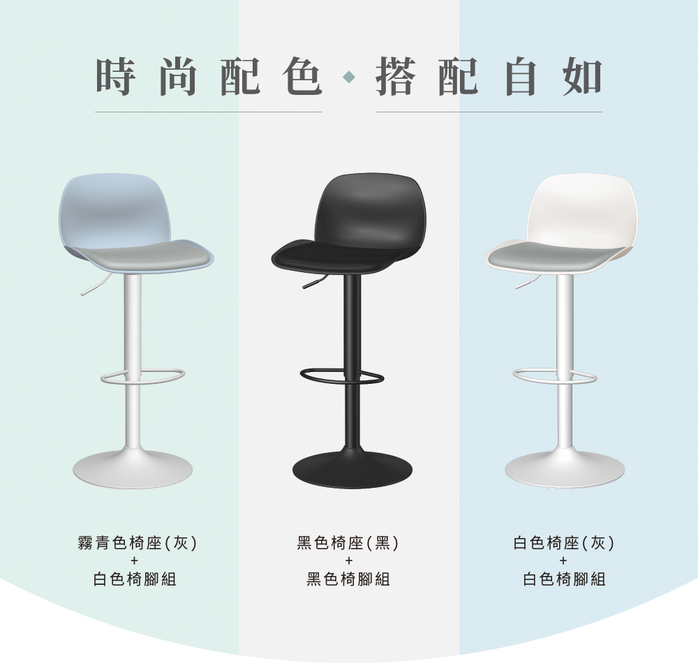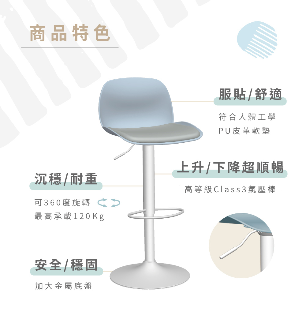 可以配合任何高度的桌子,廚房的中島桌、窗台的吧台桌…可自由的調整。選用高品質的第三等級氣壓棒CLASS 3,使其上升/下降更為流暢。