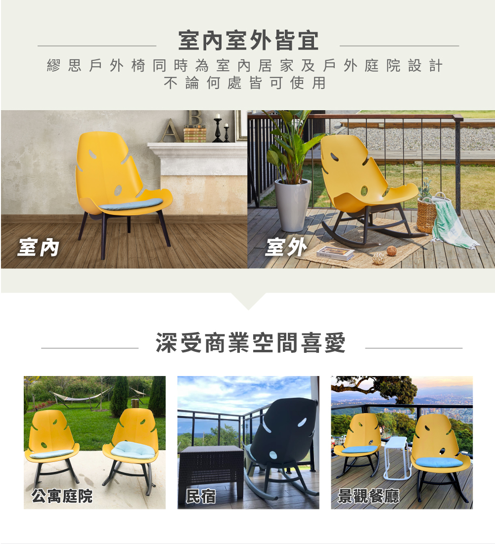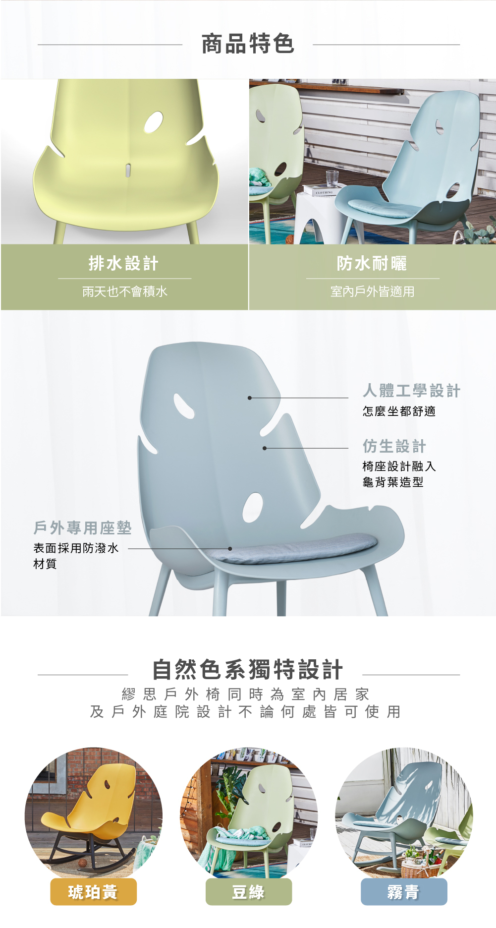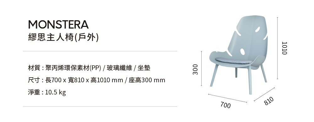 戶外款的Monstera椅擁有明亮的顏色,偌大的葉狀坐面宛如花園中的觀葉植物,將庭院、陽台點綴的春意盎然。