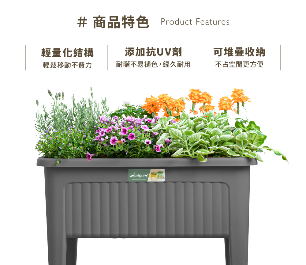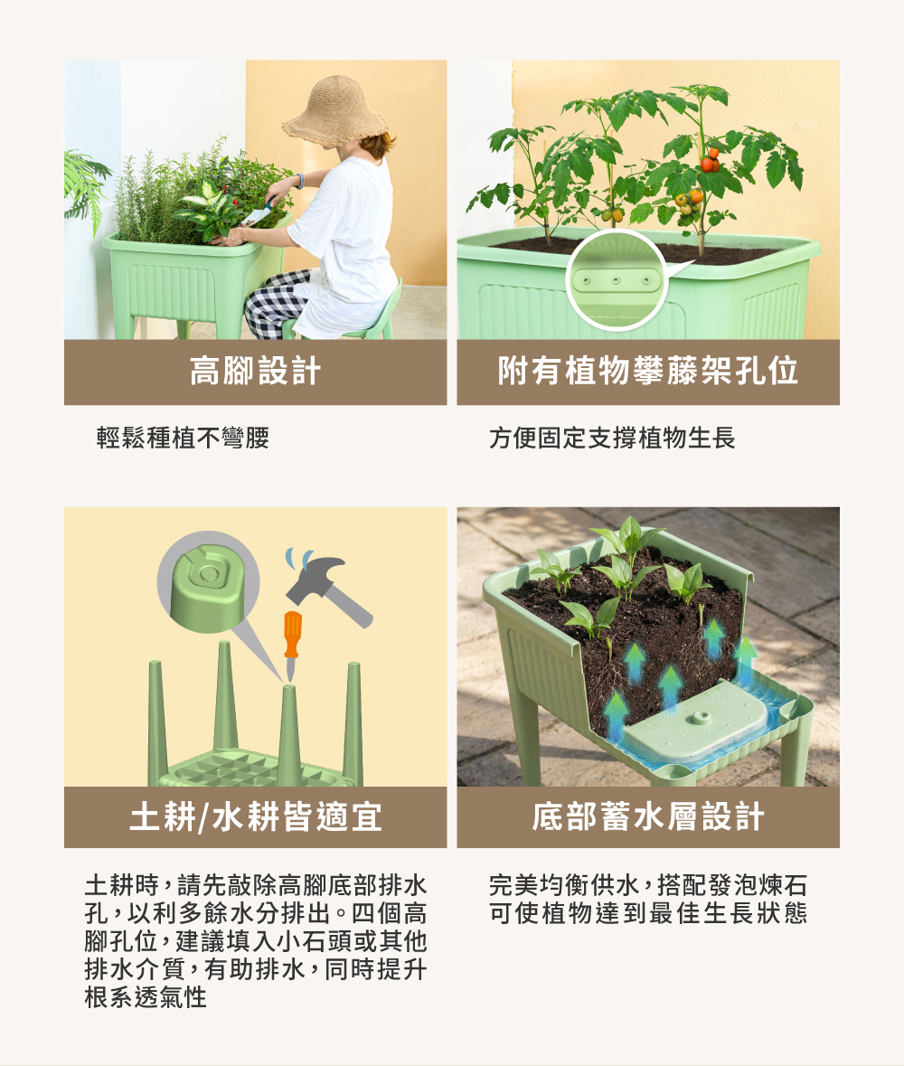 高腳免彎腰設計結合大容量種植空間與離地栽培結構,兼具排水系統與透氣設計,移動便利、降低病蟲害風險,適合陽台菜園、頂樓花園與居家園藝,輕鬆打造專屬開心農場與綠意生活。